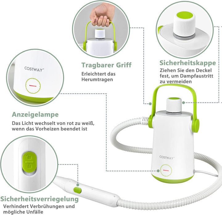 - 【Effiziente Tiefenreinigung】 Dieser chemikalienfreie Dampfreiniger Handgerät mit einem leistungsstarken 1000 W Dampfreiniger Akku und einem Arbeitsdruck von 2-3 bar verfügt über eine Dampftemperatur von bis zu 95 °C für eine optimale