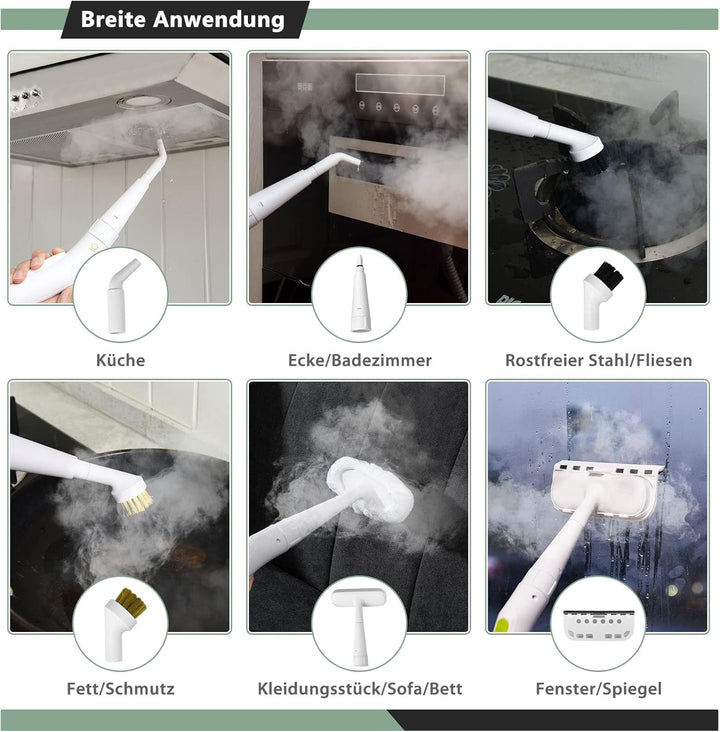 - 【Umfangreiches Zubehör】Das Paket enthält eine grosse Auswahl an Zubehör, um Ihren unterschiedlichen Anforderungen gerecht zu werden. Ein Glasreinigungsaufsatz für Fenster oder Spiegel ist im Lieferumfang enthalten. Ein Textildampfkopf für Sofas
