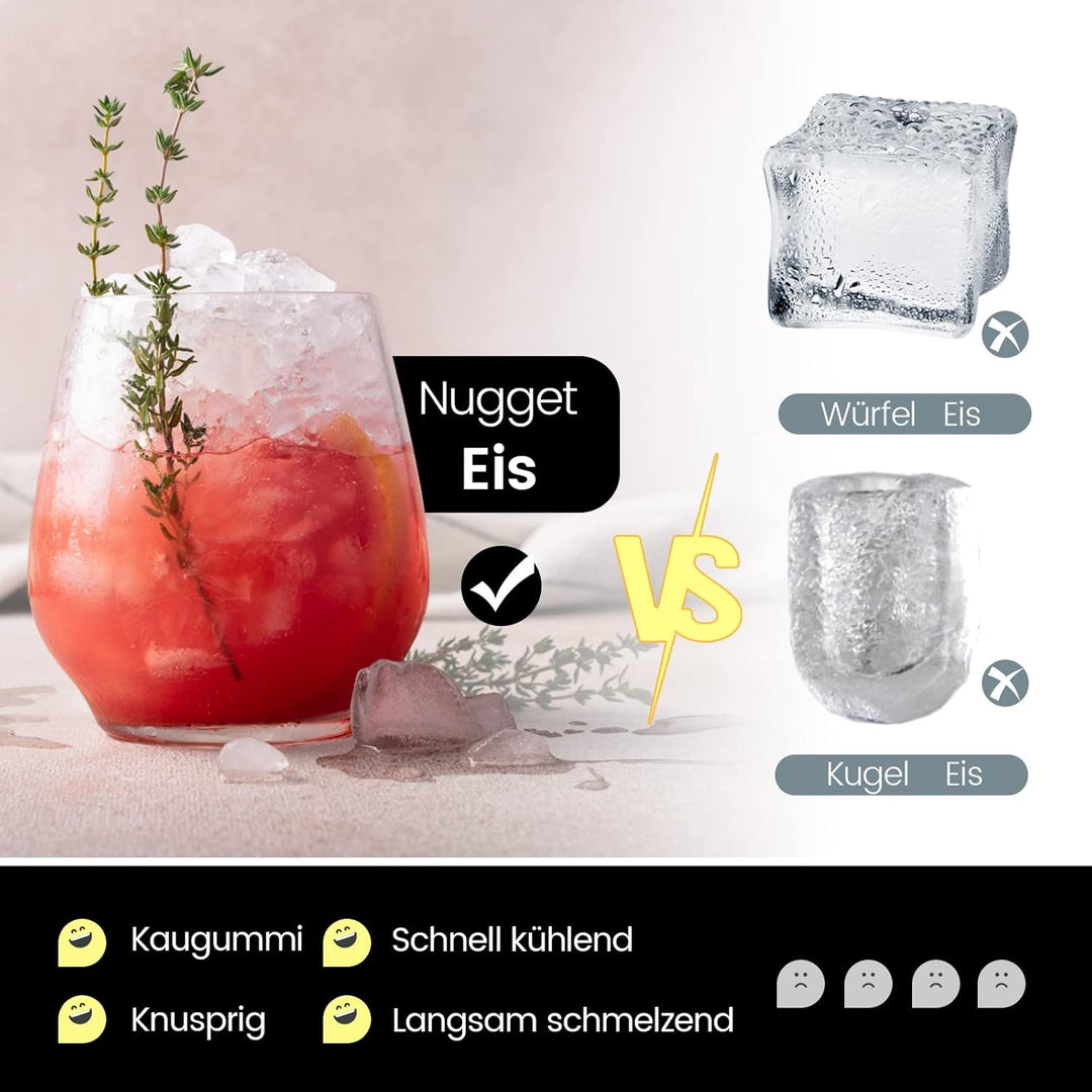 - 【Produziert 27 kg Nugget-Eis pro Tag】Ausgestattet mit einem fortschrittlichen Kompressor produziert dieser Eisbereiter 27 kg Nugget-Eis pro Tag. Ein Zyklus dauert 20 Minuten bei niedriger Temperatur oder 45 Minuten bei hoher Temperatur. Durch das 4