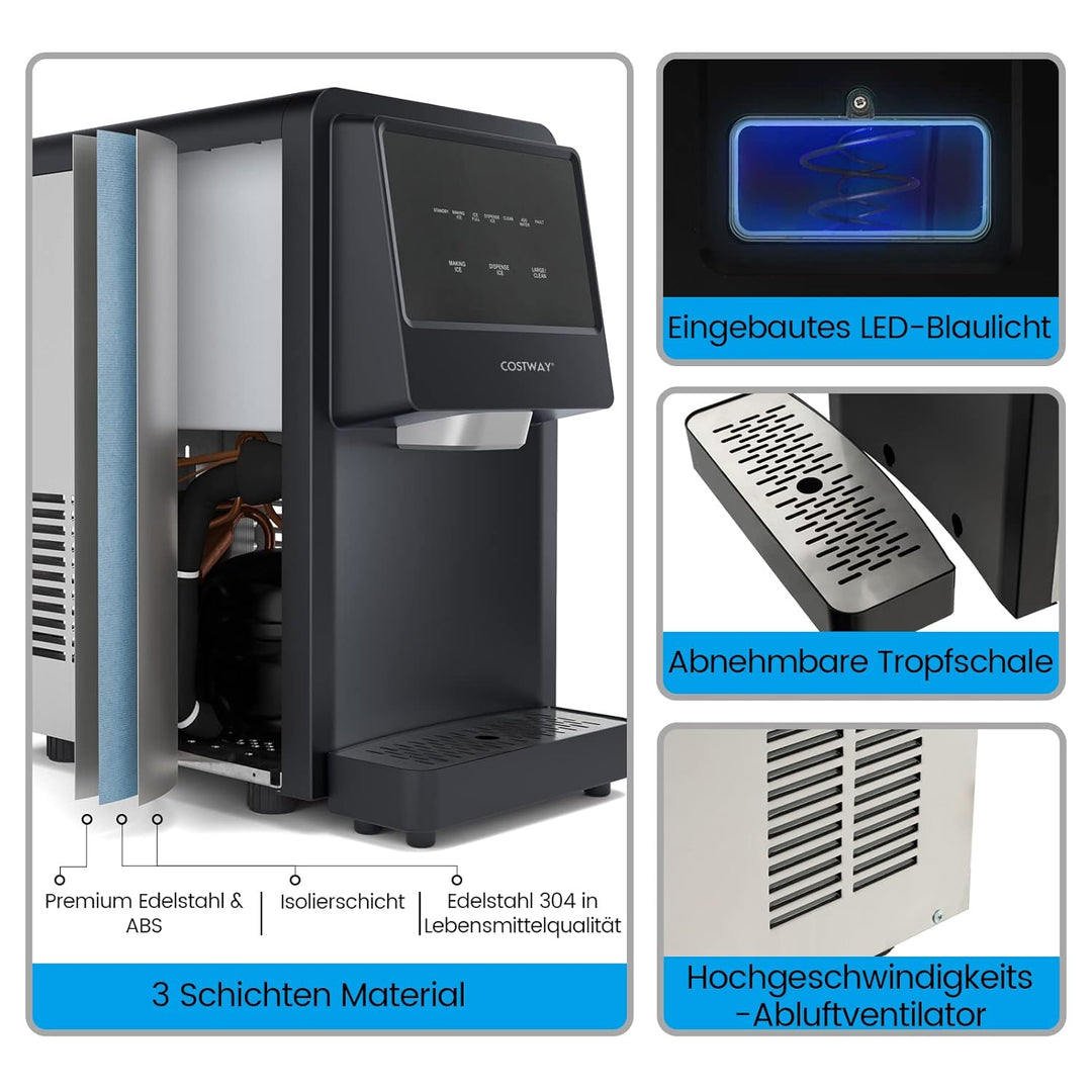 - 【Selbstreinigungsfunktion】Wenn Sie diesen Eisbereiter reinigen möchten, müssen Sie lediglich die "LARGE/CLEAN"-Taste für 3 Sekunden gedrückt halten. Die Selbstreinigungsfunktion läuft dann für 5 Minuten, um Ihnen die Hände frei zu halten.