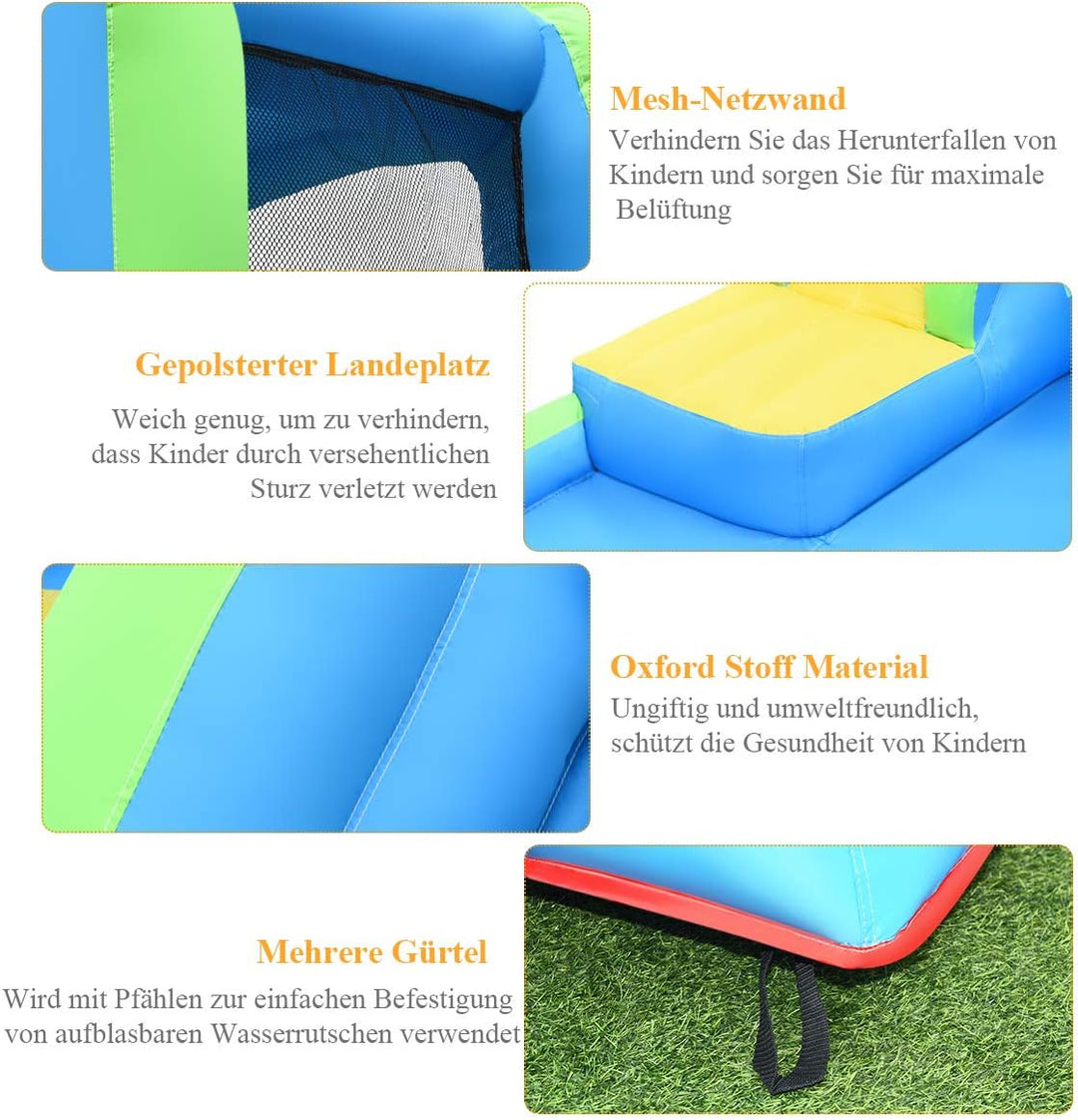 - 【Viele Spielbereiche】Dieser aufblasbare Wasserpark bietet Ihnen eine Wasserrutsche, ein grosses Planschbecken, eine Kletterwand und zwei Wasserkanonen, sodass Ihre Kinder viel Spass und verschiedene Aktivitäten zur selben Zeit geniessen können. Die