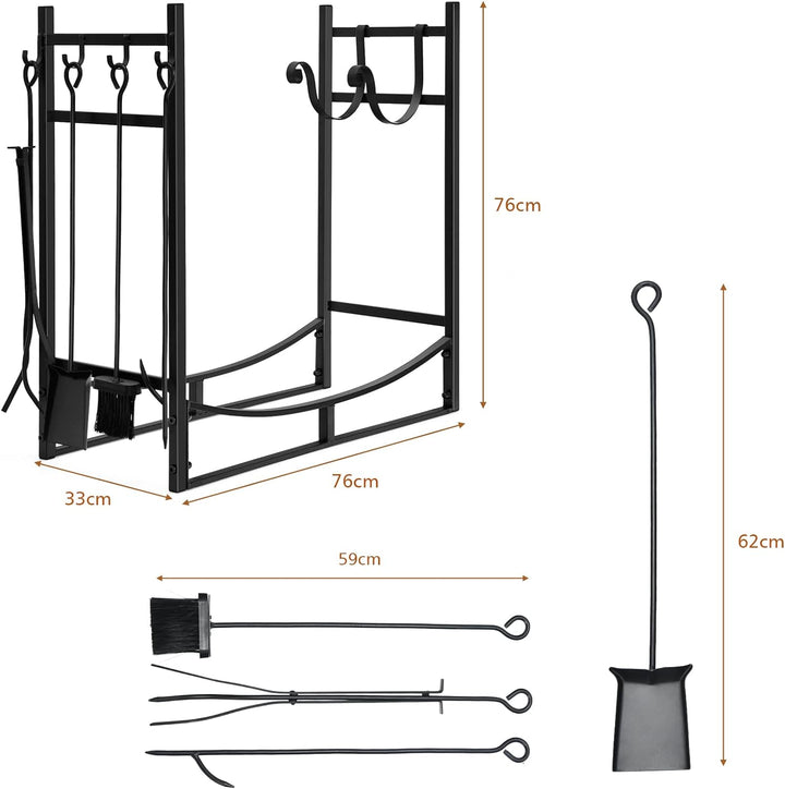 COSTWAY Kaminholzregal mit 4 tlg. Kaminbesteck Set, Brennholzregal Metall Kaminholzständer Kaminzube