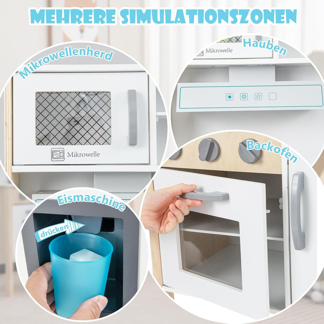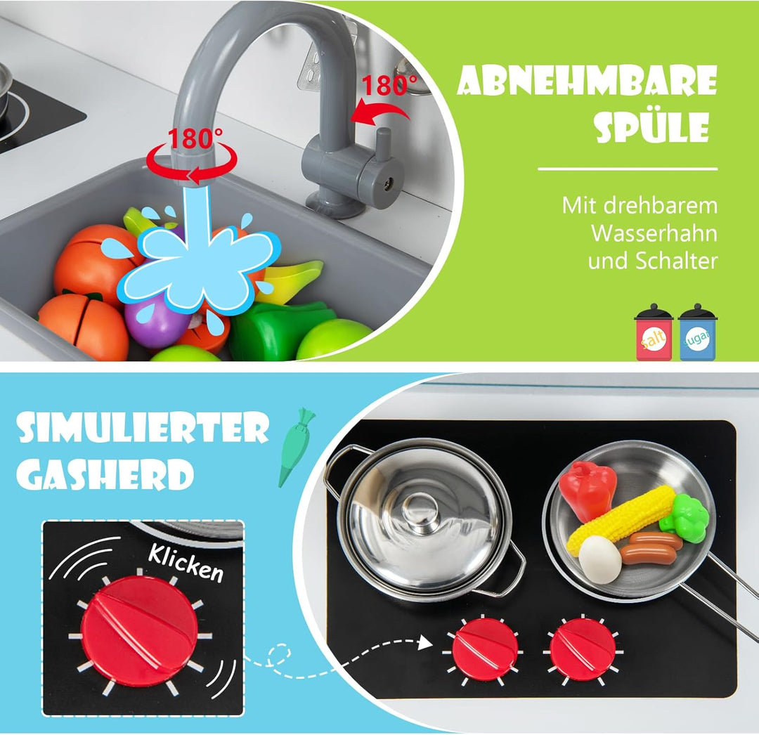 - 【Mehrere simulierte Bereiche】Die Kinderküche ist mit drehbaren Wasserhähnen und beweglichen Spülbecken sowie einem simulierten Gasherd mit "Klick"-Geräusch ausgestattet. Darüber hinaus gibt es realistische Mikrowellen, Dunstabzugshauben,