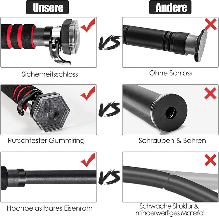 - 【Schraubenlose Montage】 Für die Montage werden keine Schrauben benötigt, hängen Sie die Stange einfach in den Türrahmen ein und verriegeln Sie sie, im Anschluss kann sie sofort genutzt werden. Dadurch müssen keine Schrauben in Wände oder