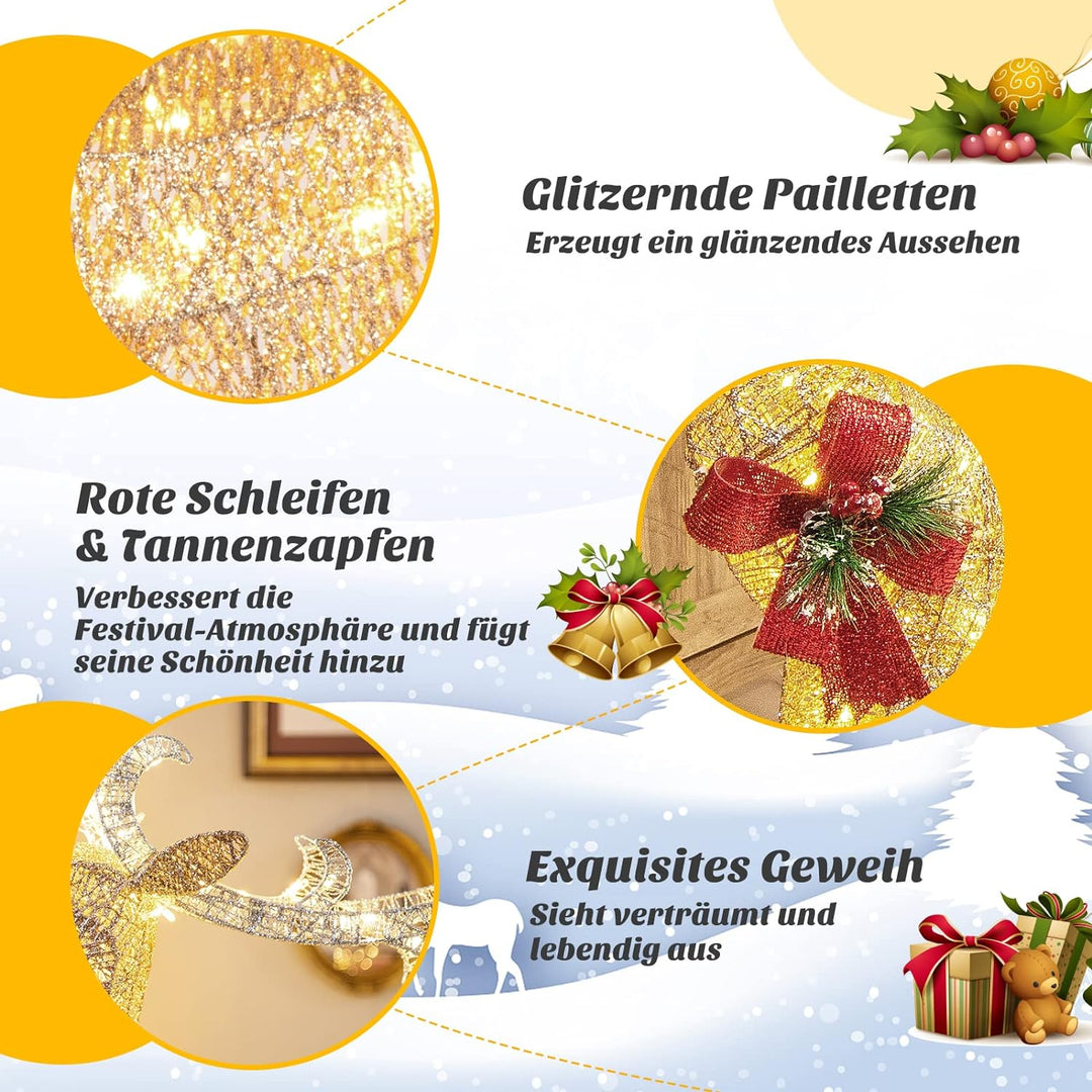 - đăProblemlose MontageăDank des einfachen Designs können Sie in kurzer Zeit ein komplett beleuchtetes Rentier und einen Schlitten erhalten, indem Sie einfach Schritt fĂŒr Schritt der detaillierten Anleitung folgen. So können Sie schnell mit Ihren