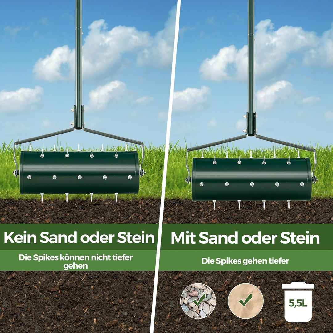 - 【Füllbare Trommel für verbesserte Belüftung】 Um eine tiefere Belüftung zu erreichen und eine bessere Wurzelentwicklung zu fördern, verfügt der Rasenlüfter über eine Trommel, die mit 5,5/6,8 l Sand oder kleinen Steinen gefüllt werden kann.