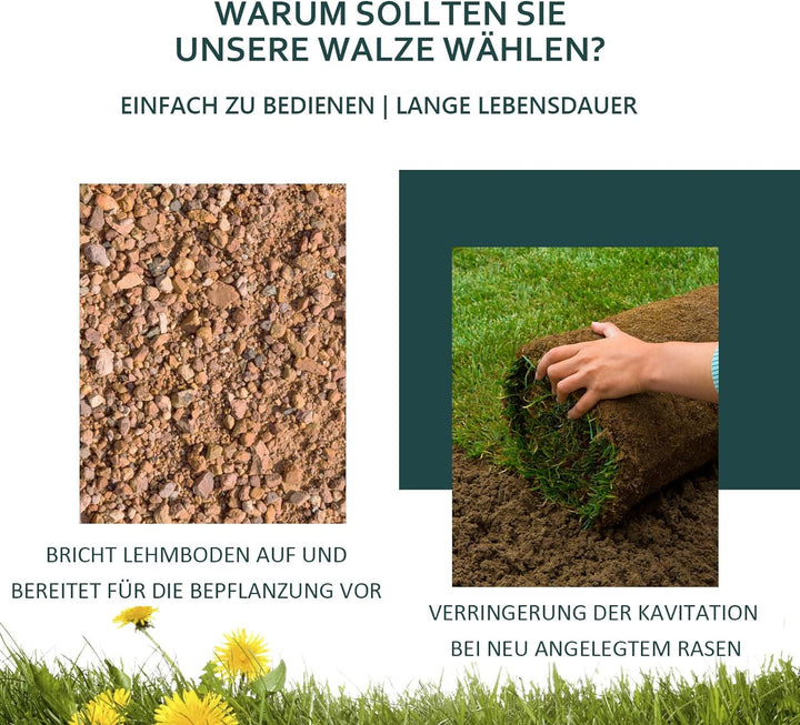 - 【Grosse Kapazität】Die Rasenwalze mit grosser Kapazität fasst bis zu 63 Liter Wasser, Sand oder Zement, und kann den hochgezogenen Rasen problemlos so wieder in seine ursprüngliche Position bringen. Die losen Rhizome sind eng mit dem darunter