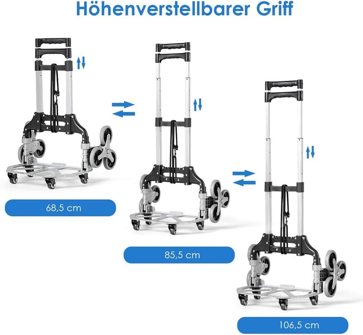 - 🧳【Anpassbarer Griff】Der Treppensteigwagen verfügt über einen in 3 Positionen verstellbaren Teleskopgriff, mit dem Sie die Höhe des Griffs nach Ihren eigenen Bedürfnissen einstellen können. Ausserdem hat der Griff ein humanisiertes Design, um