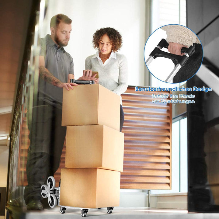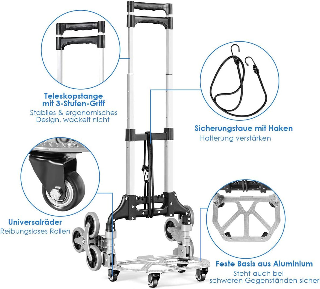 - 🧳【Klappbares Design】Der Treppensteigkarren ist nicht nur faltbar, sondern ist auch kompakt, wenn er flach zusammengeklappt wird und spart so Platz im Kofferraum, Zuhause oder im Lager. Darüber hinaus wiegt er nur 4,5 kg und ist damit leicht genug