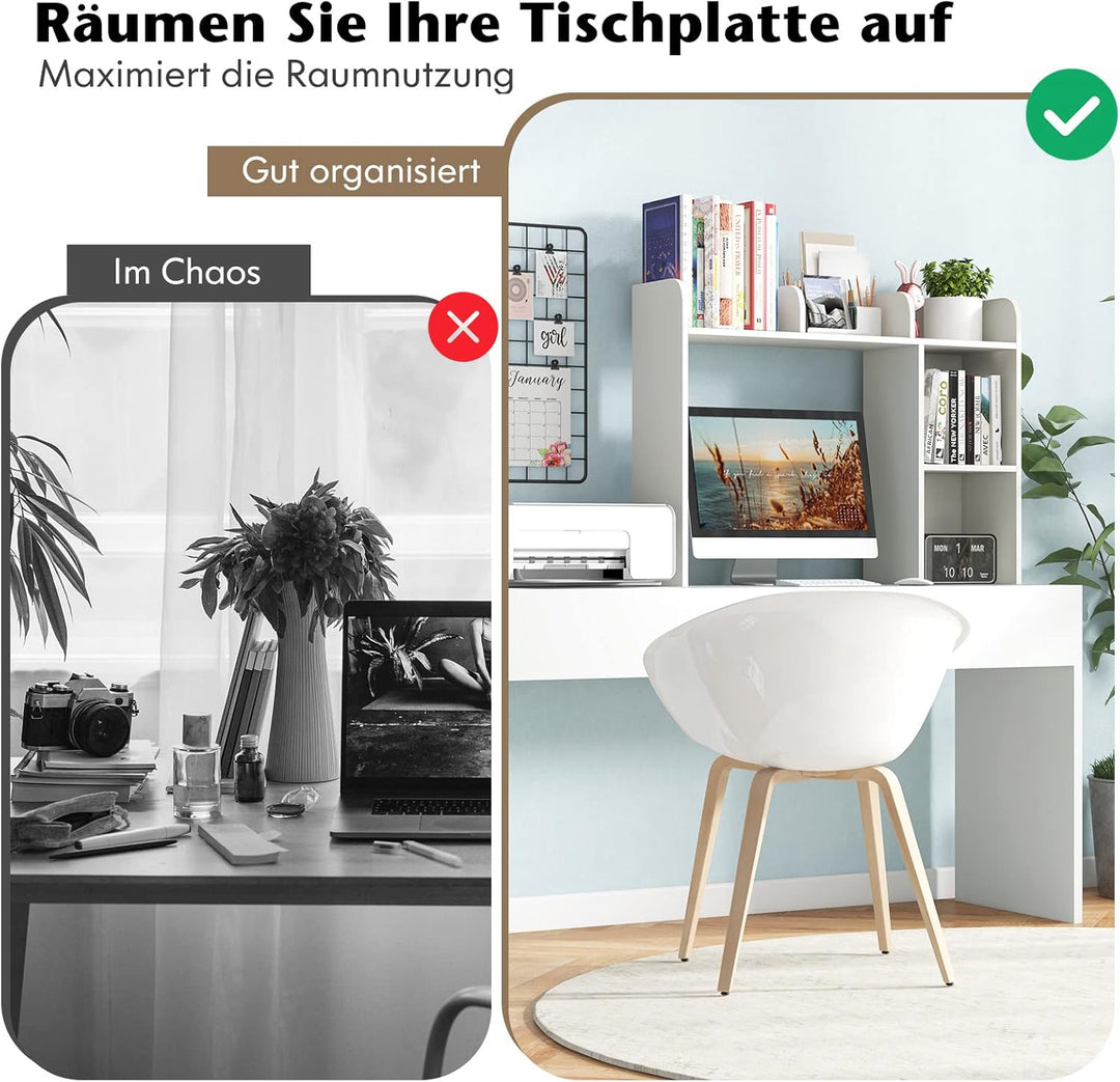 - 【Klassifizierter und vertikaler Stauraum】Um Ihre Tischplatte aufzuräumen und den Platz optimal zu nutzen, bietet Ihnen der Tischplattenstall 3 obere Regale und 2 grosse Seitenfächer, in denen Bücher, Ornamente, Kalender, Pflanzen und andere