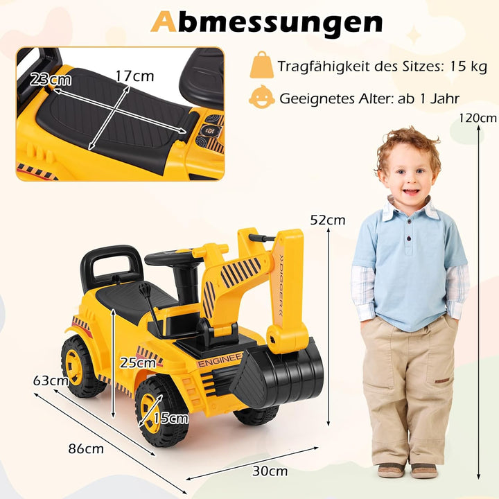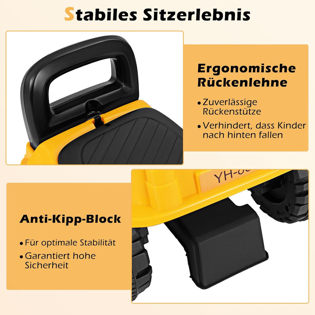 - 【Weitere Sicherheitsmerkmale】Der Sitzbagger ist eine sichere Wahl für Kinder, denn es verfügt über eine stabile Rückenlehne und eine Kippschutzbasis, um die allgemeine Stabilität zu verbessern. Ausserdem hat es pannensichere, profilierte Räder,