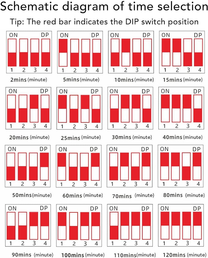 - 【Zeiteinstellung】: 2 Minuten bis 2 Stunden Einstellung, 16 Arten von Zeitdauer können beliebig ausgewählt werden, über das Zifferblattdiagramm stellen Sie die Zifferblattposition auf die entsprechende Längenposition ein, um zu arbeiten.