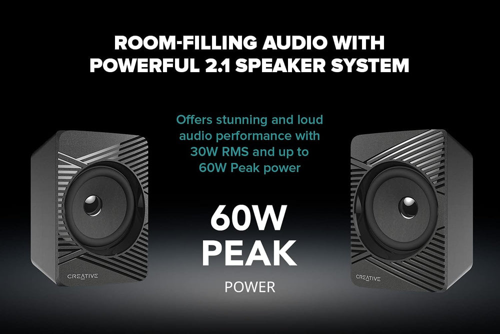 - 2.1-Lautsprechersystem mit Fernfeldtreibern - Ein leistungsstarkes 2.1-Bluetooth-Lautsprechersystem, das mit 30 W Sinusleistung und bis zu 60 W Spitzenleistung eine atemberaubend intensive Audioleistung bietet. Die Lautsprecher sind zudem mit intern