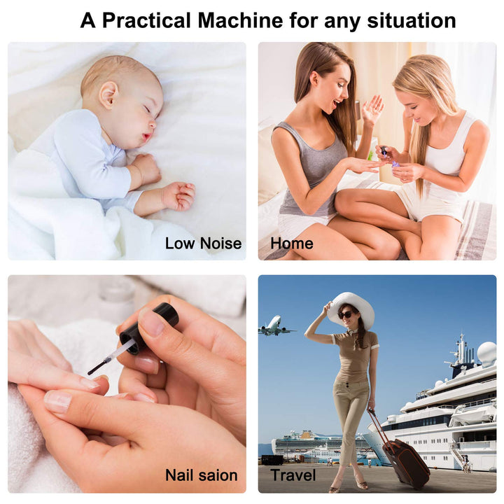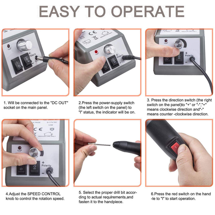 • Einstellbare Geschwindigkeit: Die Geschwindigkeit von elektrischen Nagelfeilen kann von 2000 U/min bis 20000 U/min eingestellt werden. Mit dem Betriebsschalter kann er in verschiedene Richtungen gedreht werden.