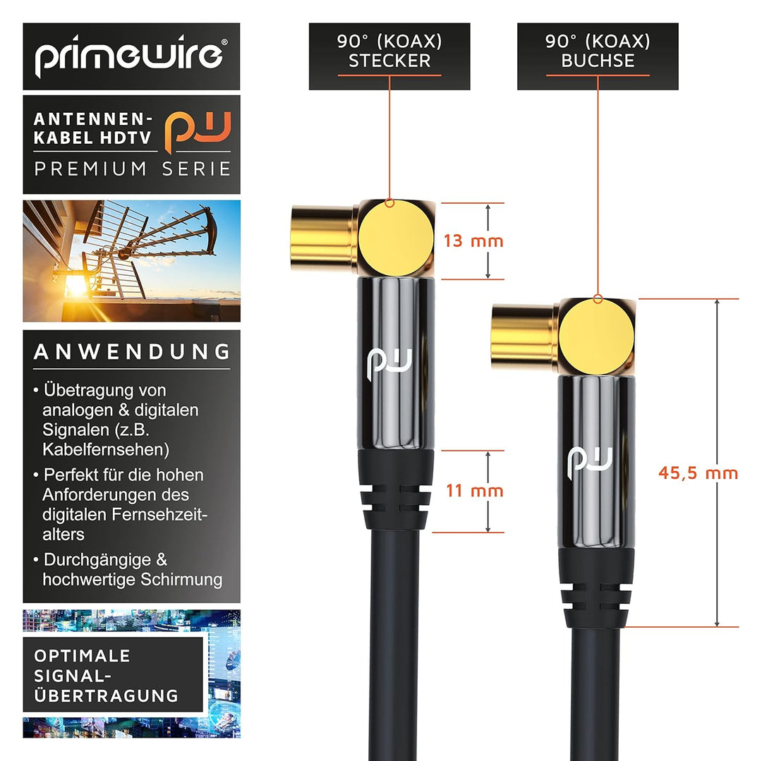 - Modellbezeichnung: Primewire 12.5m ( Meter ) Premium TV-Antennenkabel (90° gewinkelt) / IEC-Winkelbuchse 90° (female) / IEC-Winkelstecker 90° (male)| Übertragung von analogen und digitalen Signalen wie DVB-T und DVB-T2, Radio (UKW/ DAB / DAB+) sowie
