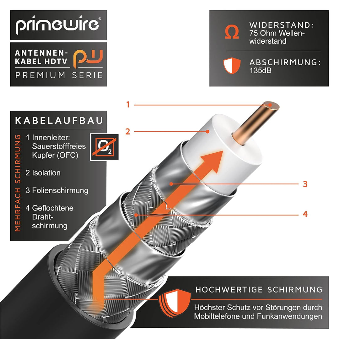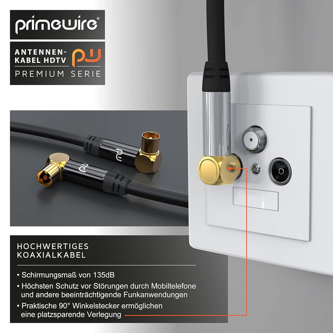 - Modellbezeichnung: Primewire 15m ( Meter ) Premium TV-Antennenkabel (90° gewinkelt) / IEC-Winkelbuchse 90° (female) / IEC-Winkelstecker 90° (male)| Übertragung von analogen und digitalen Signalen wie DVB-T und DVB-T2, Radio (UKW/ DAB / DAB+) sowie