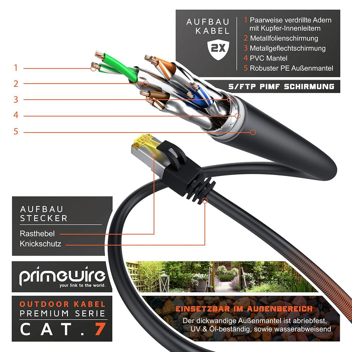 - Mit seinem robusten Aussenmantel ist das Primewire CAT7 Outdoor-Kabel erste Wahl im Ausseneinsatz, im privaten ebenso wie im industriellen Umfeld. Der Aussenmantel ist UV-beständig, Öl-beständig, wasserabweisend und abriebfest. Zudem halogenfrei.