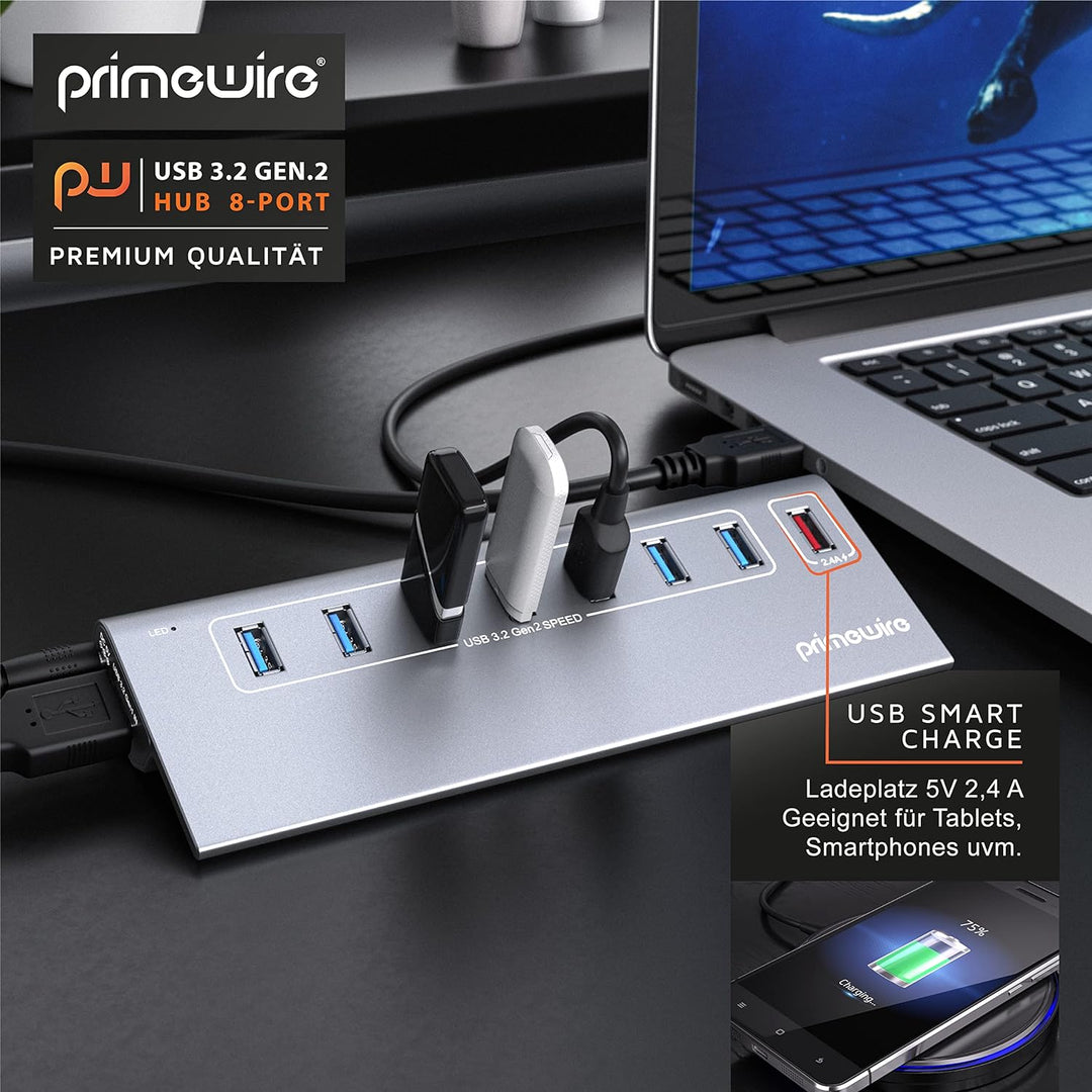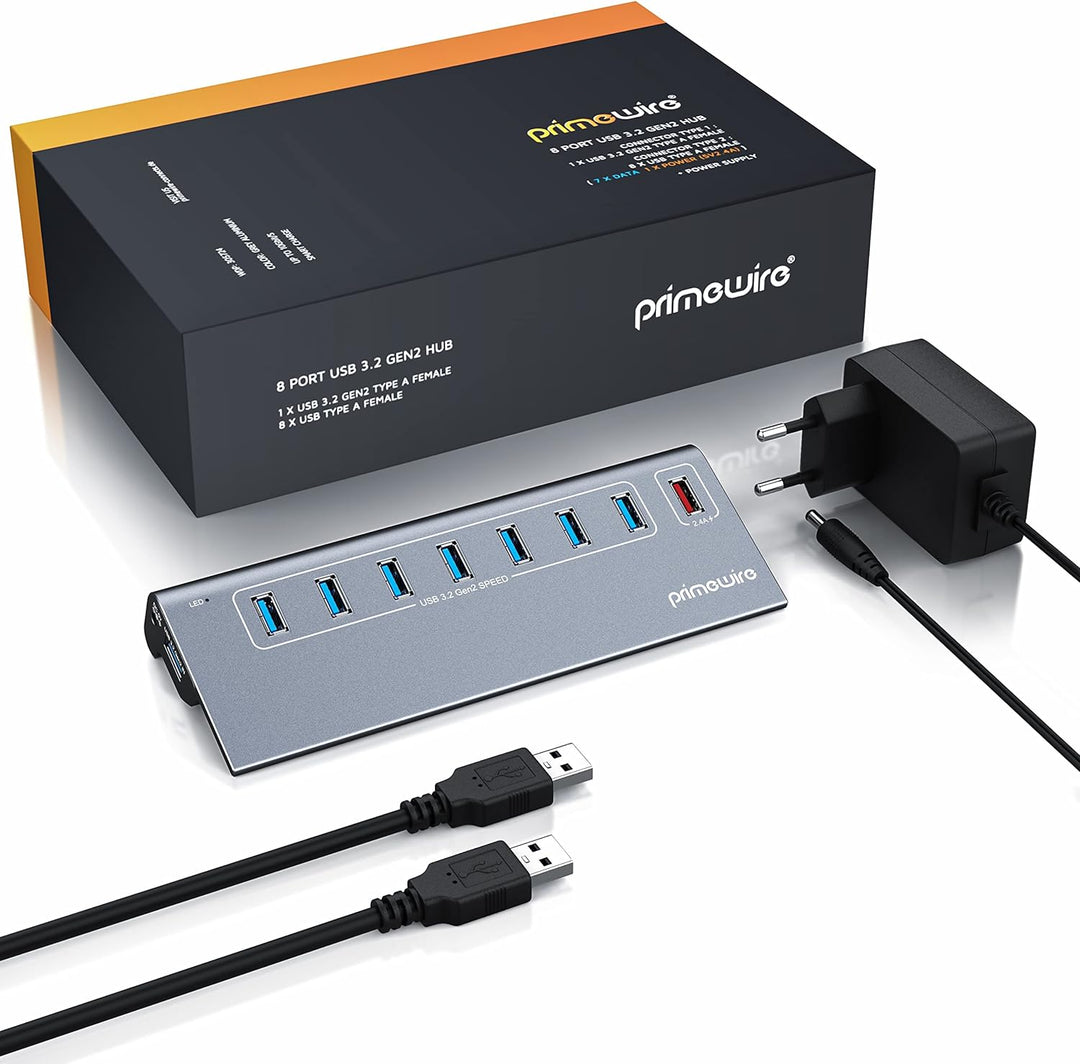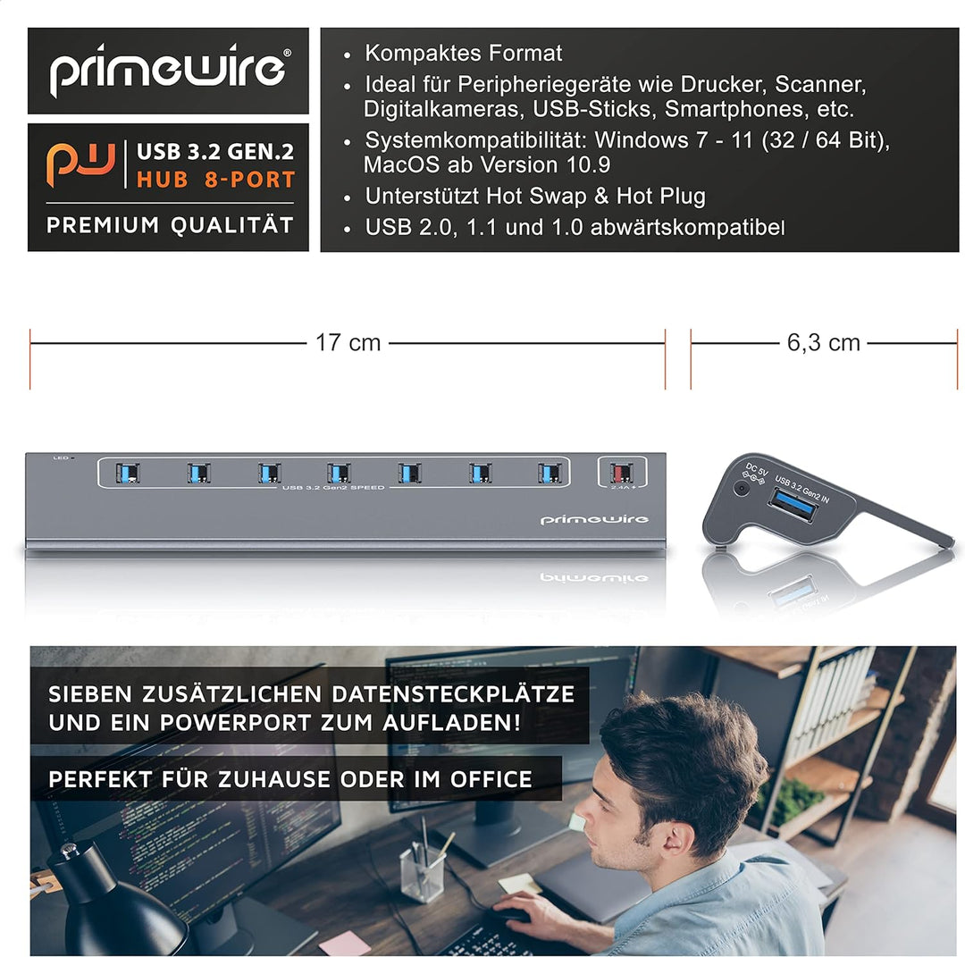 • 7 x Datenports und 1 x Ladepower: Der Primewire 8 Port USB-Hub erweitert eine einzige USB 3.2. Gen.2-Schnittstelle um 7 Datensteckplätze und einen PowerPort! Ideal für alle Windows Desktop-PCs, Notebooks, Laptops sowie Macbooks, Mac Mini und iMac (Pro)