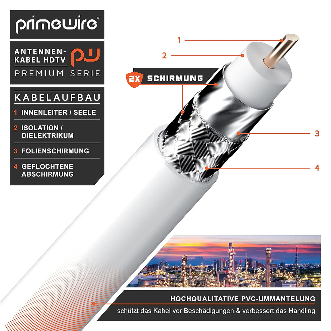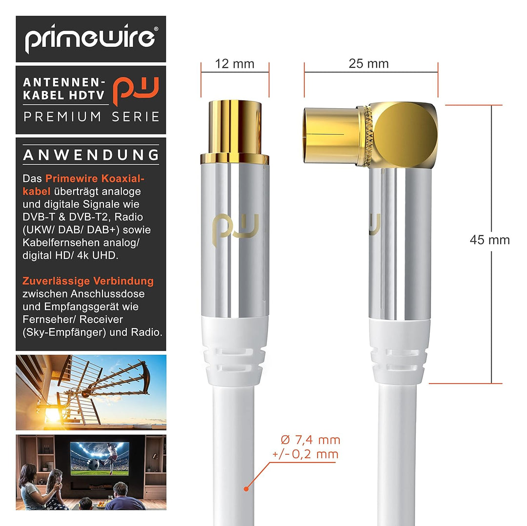 - Primewire Premium TV-Antennenkabel. Koax-Buchse mit Winkel 90° auf Koax-Stecker (gerade). | Überträgt analoge und digitale Signale wie DVB-T und DVB-T2, Radio (UKW/ DAB / DAB+) sowie Kabelfernsehen analog/digital HD/4k UHD I | Stellt eine