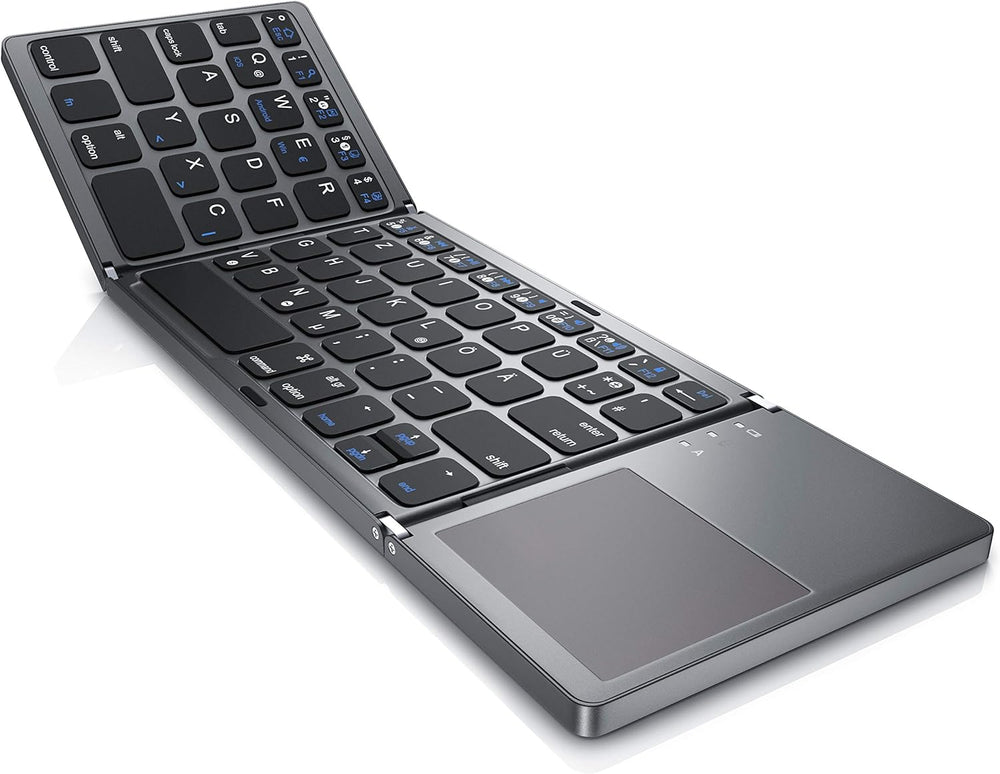 - Die faltbare Mini Bluetooth-Tastatur mit Touchpad wurde entwickelt, um auf Reisen noch in die kleinste Tasche zu passen. Zusammengefaltet misst sie gerade mal 15 x 10 cm und ist damit nur geringfügig grösser als ein Smartphone. Das gar nicht mal so