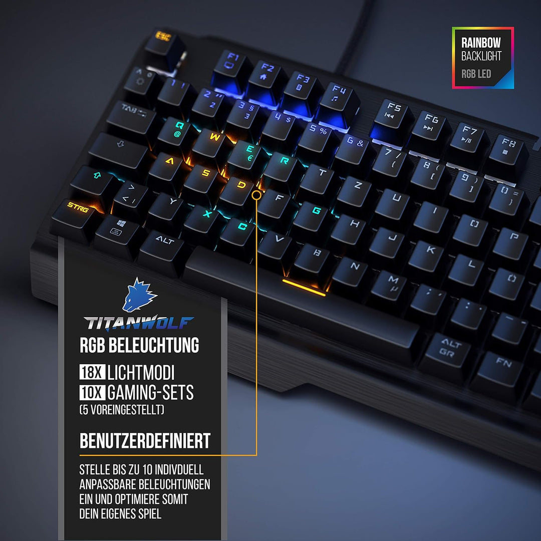 - Die Titanwolf Alumar Tastatur ist ein Statement: exzellent verarbeitet, mit einer Trägerplatte aus Aluminium und ausgestattet mit hochpräzisen mechanischen Tasten von Kailh Blue. Die vielen Lichtmodi sehen nicht nur klasse aus: Dank der frei
