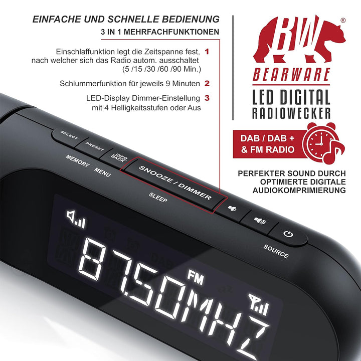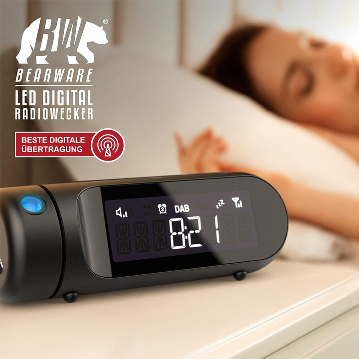 • PRODUKTEIGENSCHAFTEN: Multifunktionaler Radiowecker mit 20 FM und 20 DAB(+) Radio-Speicherplätzen | grosse Projektion der Uhrzeit | 2 Alarmzeiten | Abschalttimer 5 / 15 / 30 / 60 / 90 Minuten | 16 Lautstärkestufen und stumm | Alarmmodi: Radio und