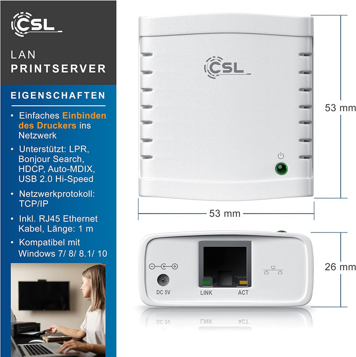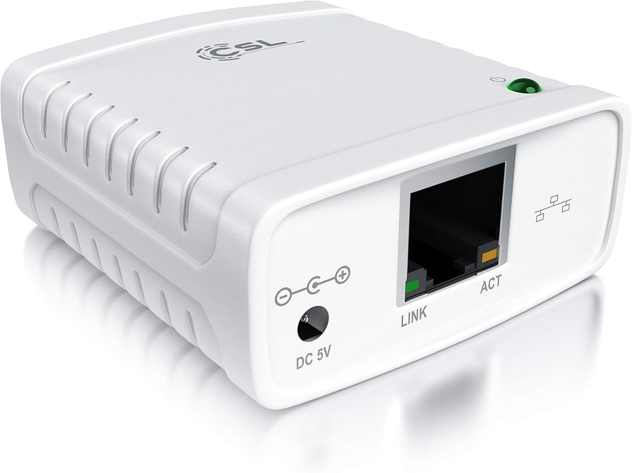 - Die ideale Lösung für die gemeinsame Nutzung von USB-Druckern z.B. in kleinen Büronetzwerken oder im heimischen Umfeld! Mit dem CSL Printserver binden Sie einen Drucker in ein Netzwerk ein. Dazu an der einen Seite das RJ45 Kabel vom Router in den
