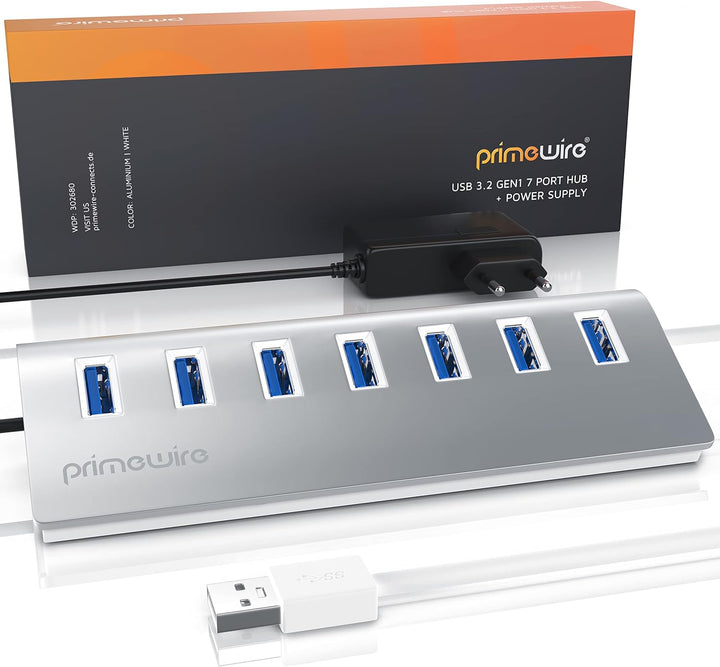 - Modellbezeichnung: CSL USB 3.2 Gen1 Super Speed 7-Port Hub inkl. 5V/2A Hohlstecker-Netzteil (3,5mm x 1,35mm) | gebürstetes Aluminium-Case | Bauart: extern | Anschlüsse: 1× USB Typ A Stecker / 7× USB Typ A Buchse / 1x DC-Hohlbuchse 3,5mm x 1,35mm