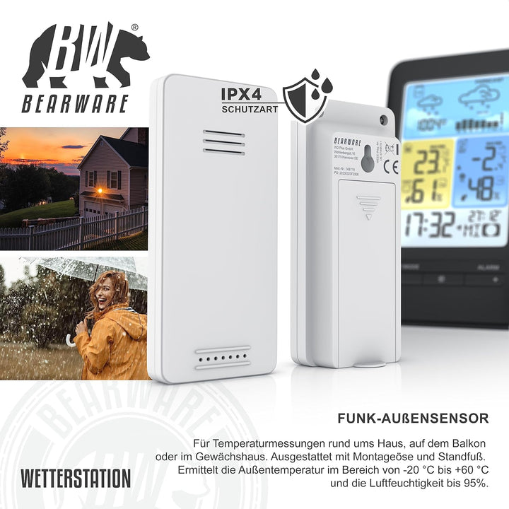 - FUNK-AUssENSENSOR: Für Temperaturmessungen rund ums Haus, auf dem Balkon oder im Gewächshaus. Ausgestattet mit Montageöse und Standfuss. Ermittelt die Aussentemperatur im Bereich von -20 °C bis +60 °C und die Luftfeuchtigkeit bis 95%. Reichweite:
