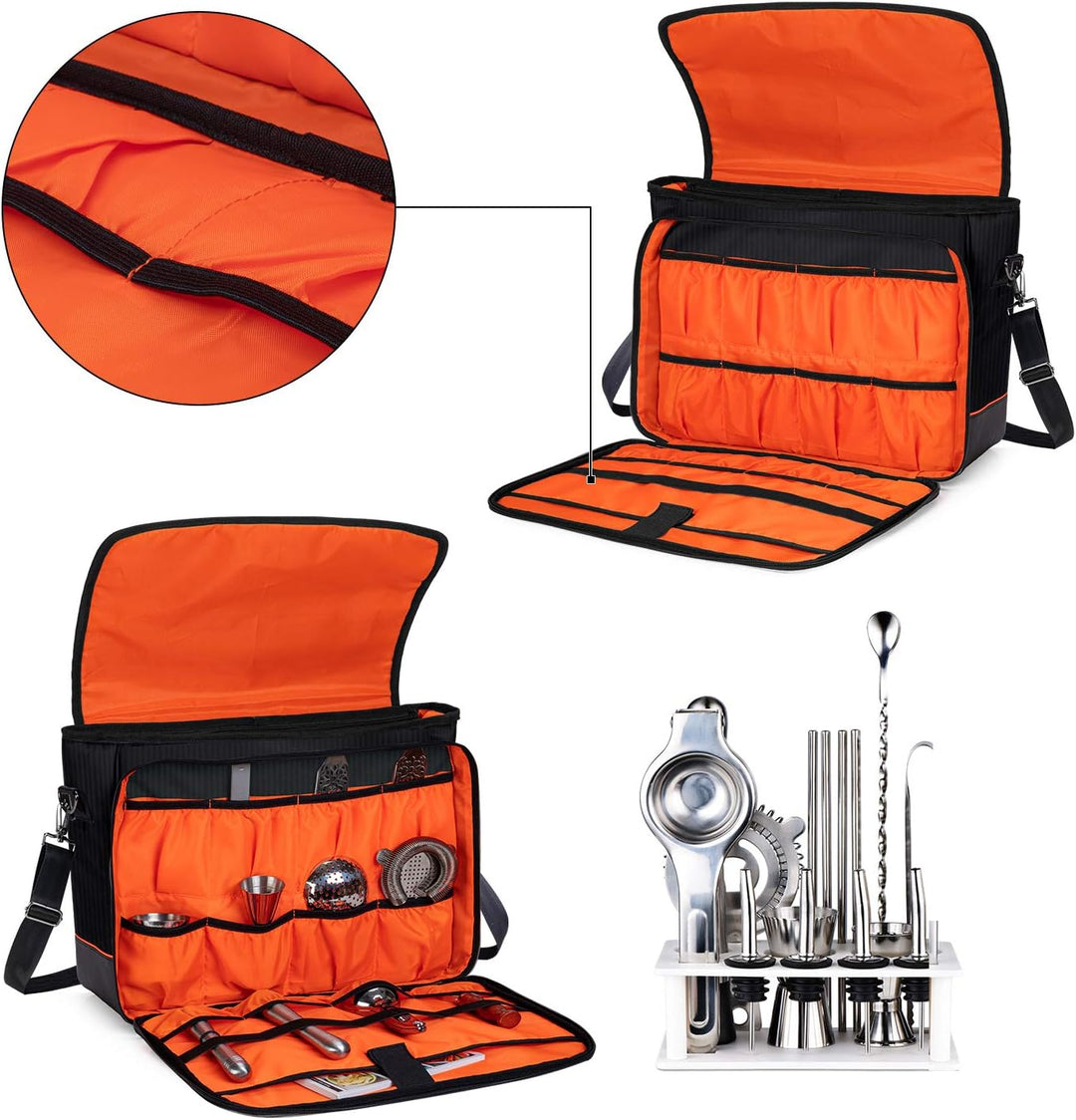 - Hochwertiges Material: Die Cocktail Set Aufbewahrungstasche besteht aus hochwertigem und strapazierfähigem Nylonmaterial. Das gut gepolsterte Innenpolster schützt Ihre Bar Zubehör vor Beschädigung von Stossen. Das stilvolle orangefarbene Interieur lässt Ihre Tasche einzigartig aussehen.