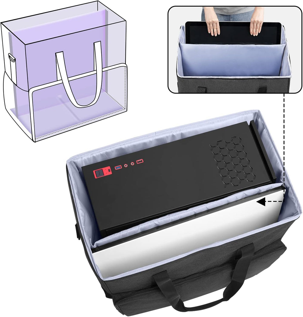 - Toller Schutz: Die Innenseite der PC-Transporttasche ist mit Schaumstoff gut gepolstert. Die PC-Tragetasche verfügt über 4 unteren Fusspolster am Boden der Tasche und eine abnehmbare, faltbare, gepolsterte Polster, schützt Ihre Desktop, Display und PC