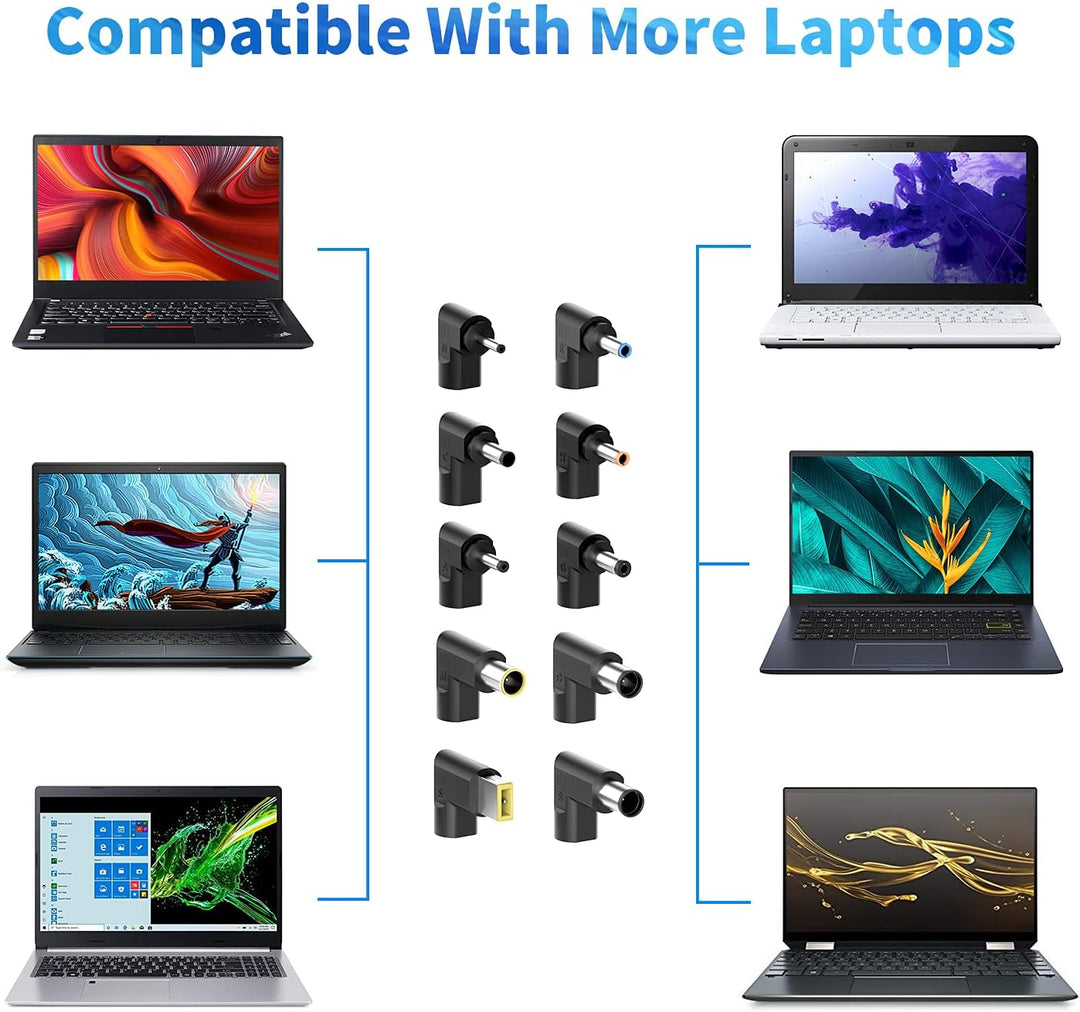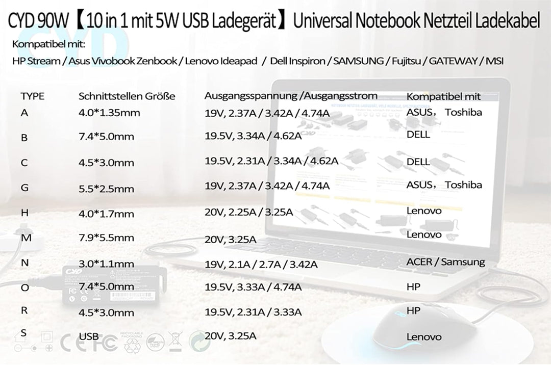 • ✅【10 in 1 mit 5W /2A USB Ladegerät】Eingang: 100-240V 50-60Hz; Ausgang: 18.5V 19V 19.5V 20V - 90W(max); 【A】: 4.0*1.35mm Kompatibel mit ASUS, Toshiba【B】7.4*5.0mm, Kompatibel mit DELL 【C】4.5*3.0mm, Kompatibel mit DELL 【G】5.5*2.5mm,
