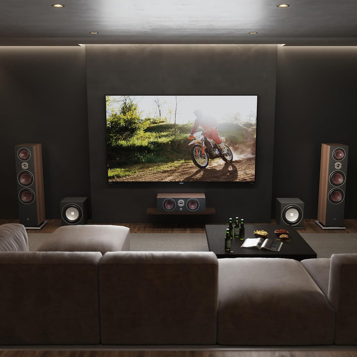 - Optimale Platzierung: Dank der kompakten Grösse und der mitgelieferten Spikes für eine effektive Entkopplung lässt sich der Subwoofer flexibel im Raum positionieren.