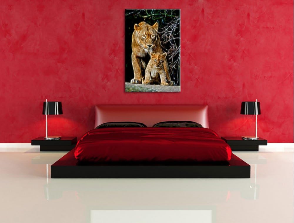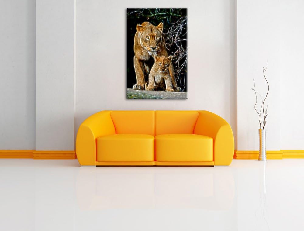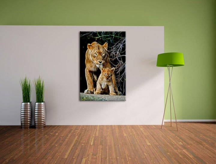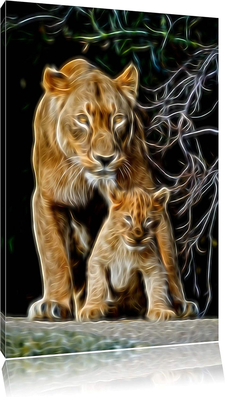 Dark Löwin mit Jungtier Deluxe Format: 100x70 cm auf Leinwand, XXL riesige Bilder fertig gerahmt mit
