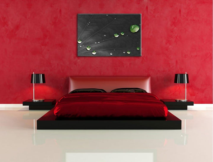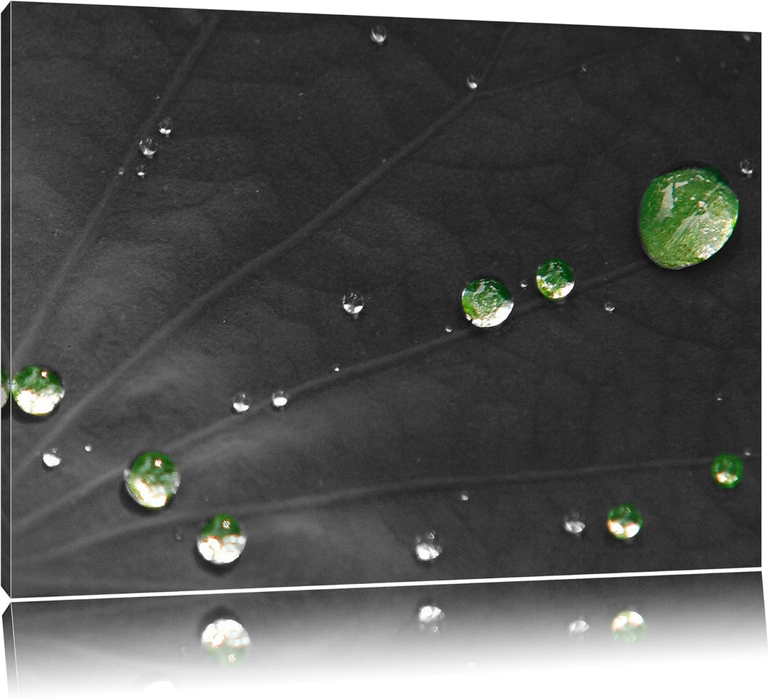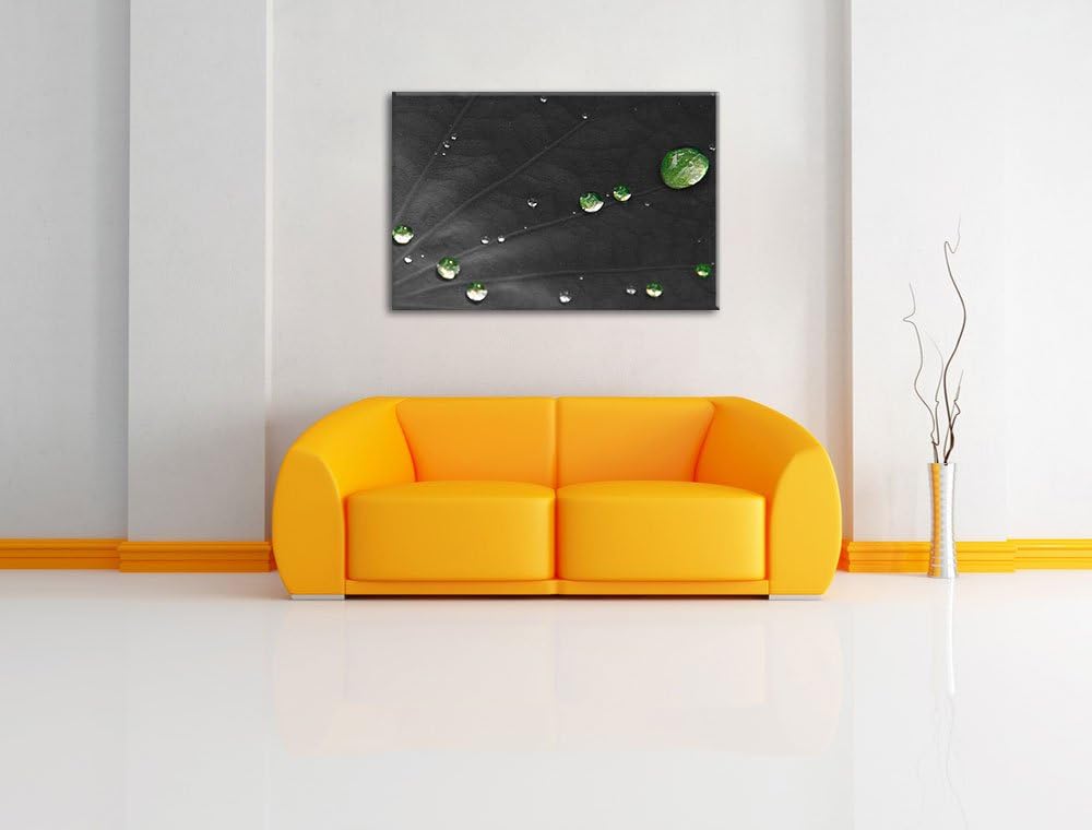 Dark winzige Wassertropfen auf grünem Blatt schwarz/weiss auf Leinwand, XXL riesige Bilder fertig ge