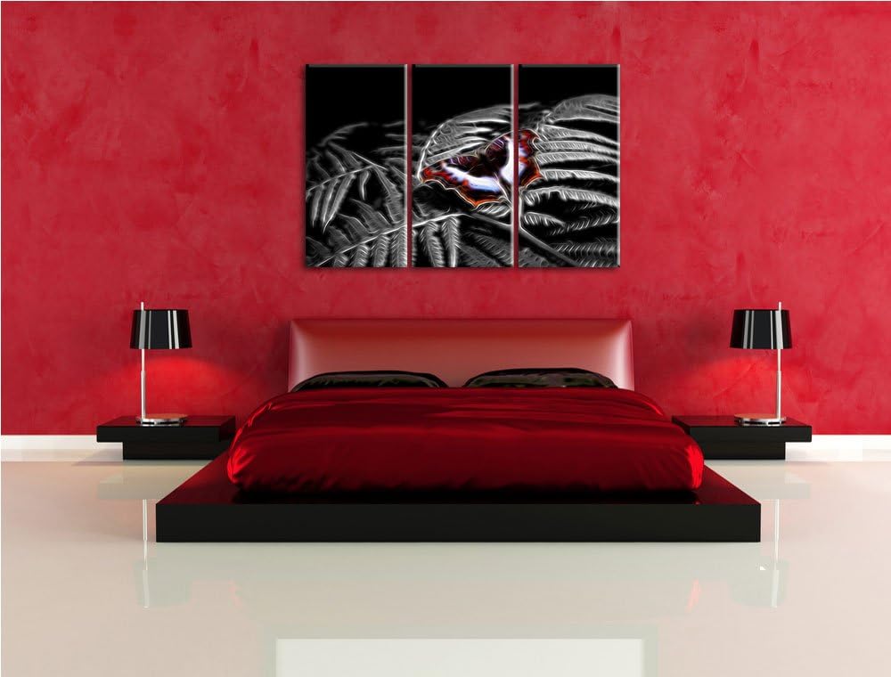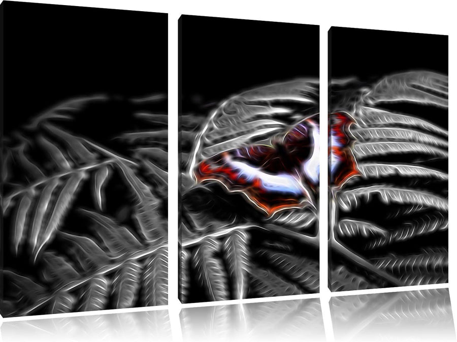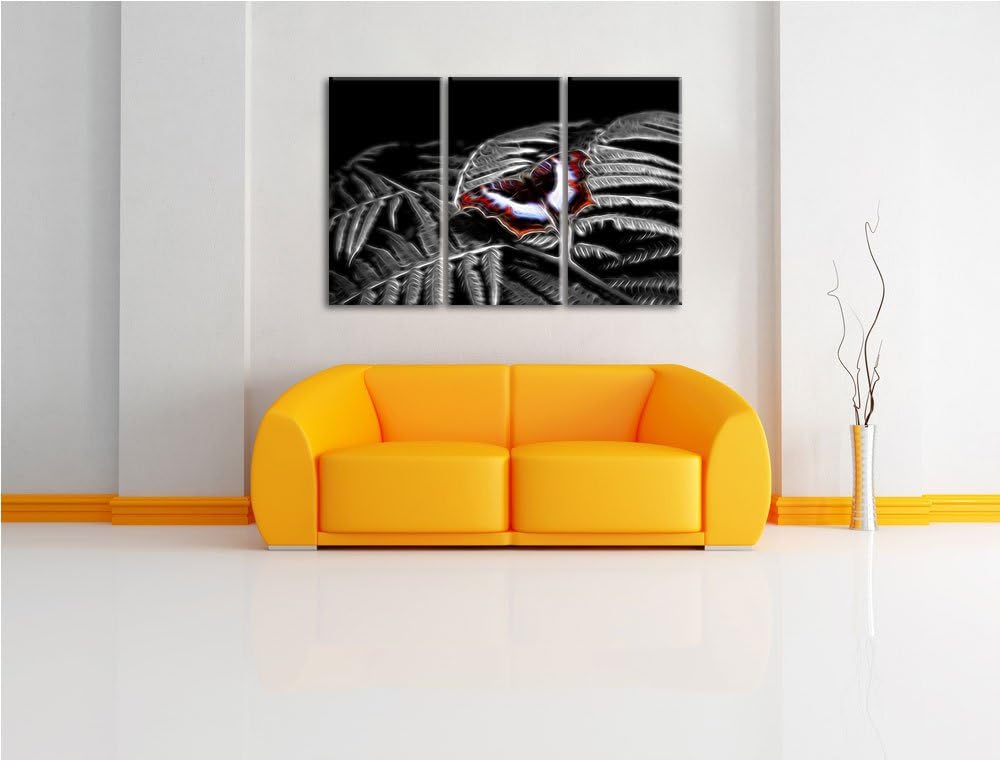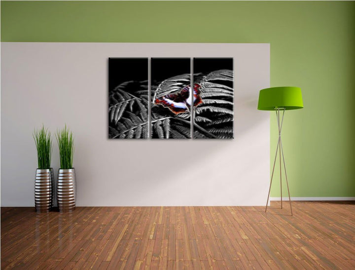 Dark zarter kleiner Schmetterling auf Farnblatt schwarz/weiss Spezial 3-Teiler Leinwandbild 120x80 B