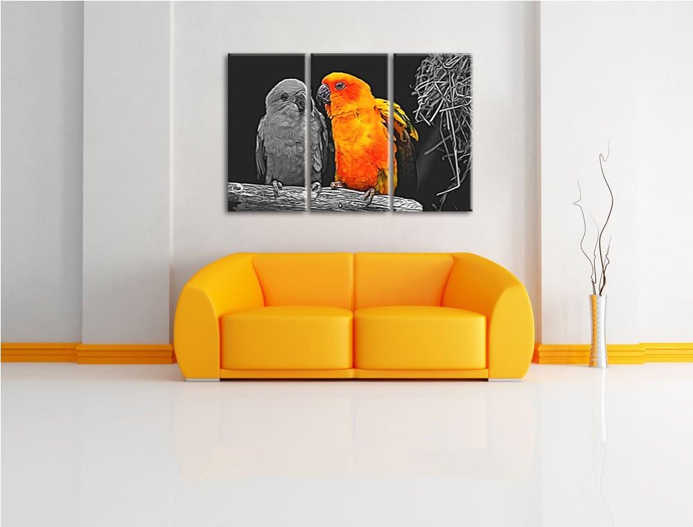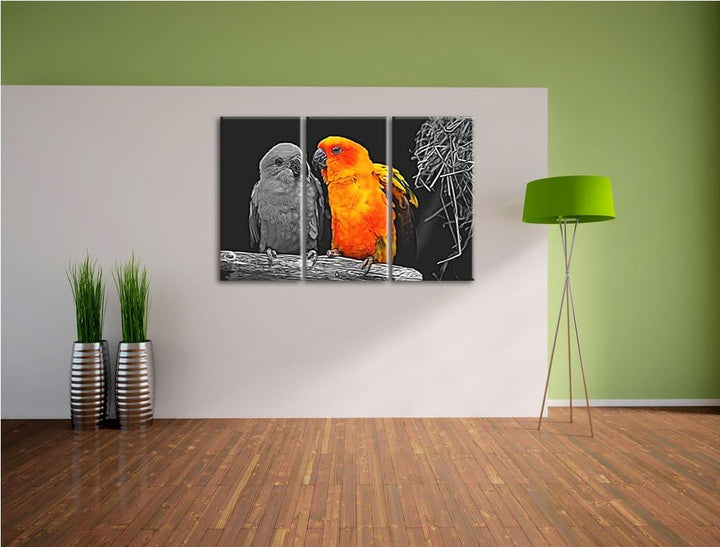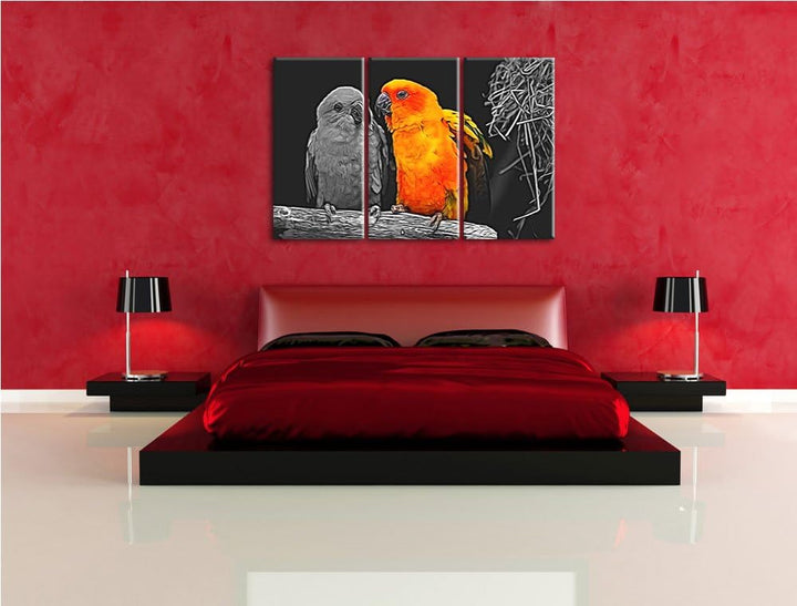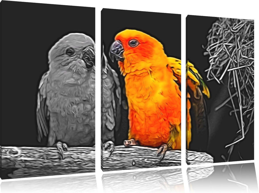 Dark zwei hübsche Sonnensittiche schwarz/weiss Spezial 3-Teiler Leinwandbild 120x80 Bild auf Leinwan