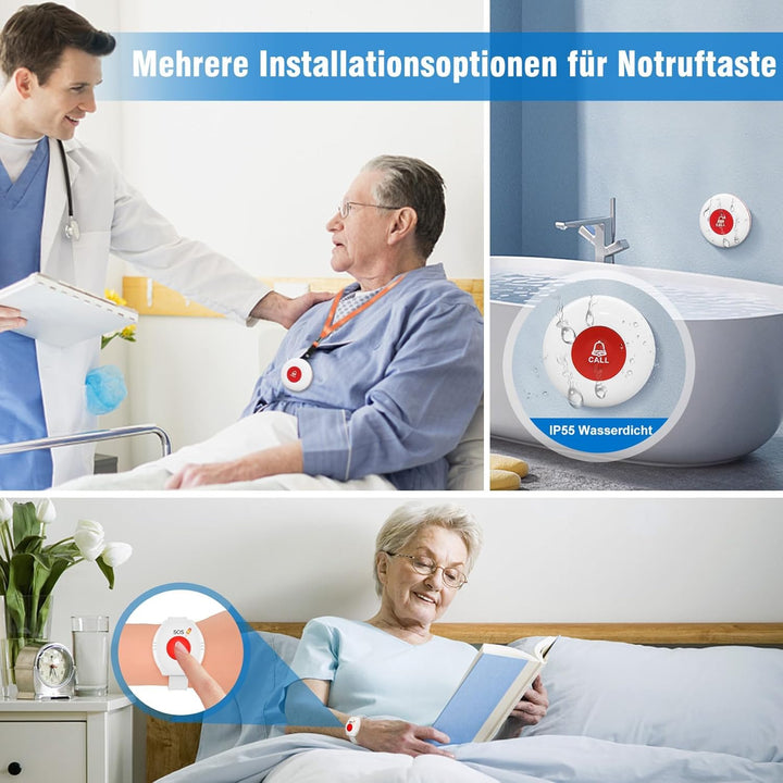 - 【Jeder Kann Es Bedienen】 Selbst bei eingeschränkter Funktion der Hände kann eine Person den Pager oder die Klingeltaste drücken, um Hilfe zu holen. Das mitgelieferte Umhängeband sorgt dafür, dass der Pager für ältere Menschen immer leicht