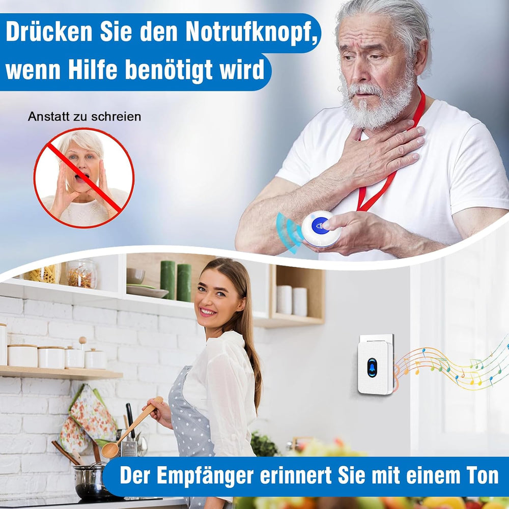 - 【Home Reichweite】 Die notklingel für senioren Reichweite beträgt 500+ Fuss im offenen Bereich,Kann durch die Wand gehen,Wenn Familienmitglieder irgendwo im Haus einen Knopf drücken, kann der Empfänger das Signal empfangen.