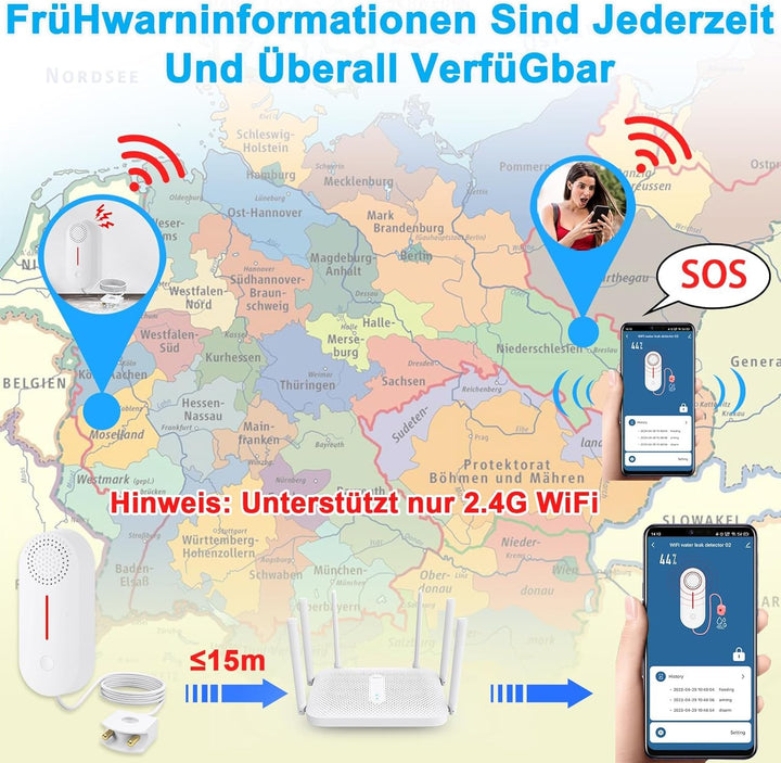 - 【Mobiltelefon-Benachrichtigungsfunktion】Der Alarm ist nahtlos mit der APP Ihres Mobiltelefons verbunden. Sobald der Alarm ausgelöst wird, sendet die APP des Mobiltelefons sofort eine Benachrichtigung, so dass Sie die Überschwemmungssituation in