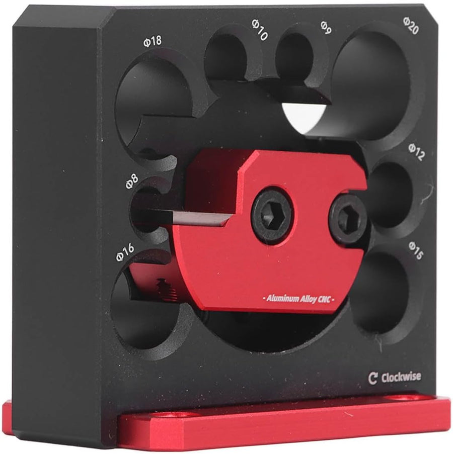 - 8 Drehlöcher: Die Dübelherstellungslehre verfügt über 8 Drehlöcher mit unterschiedlichem Durchmesser. Lösen Sie die Schraube und drehen Sie den roten Halter auf den gewünschten Durchmesser, ziehen Sie die Schraube wieder fest und schon kann es