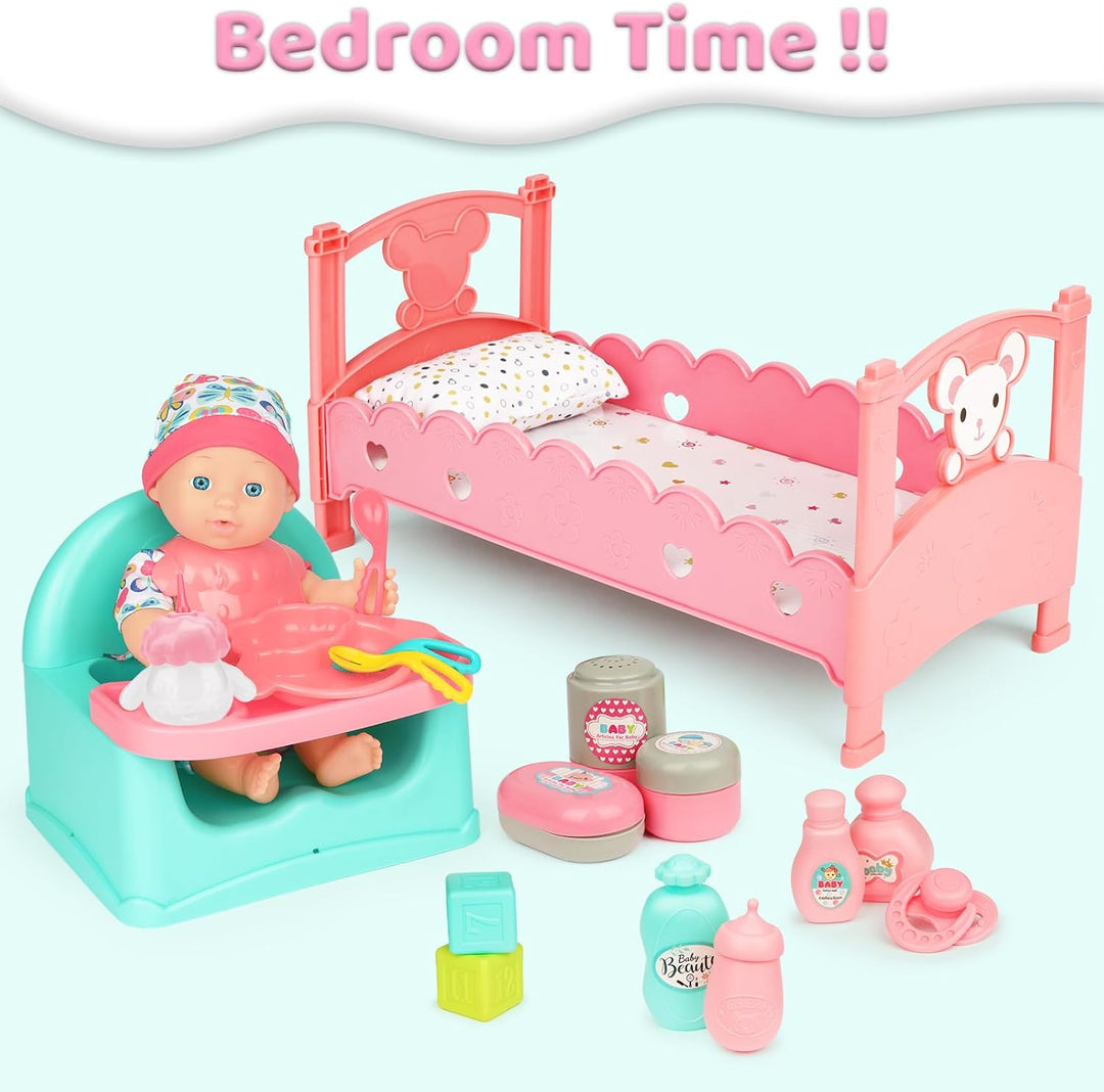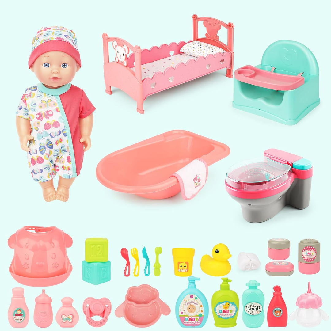 - 31 Teile Kinderzimmer Spielset- Das Zubehör Enthält 1 Puppe, 1 Satz Kleidung und Hut, 1 Bett, 1 Puppensitz, 1 WC, 1 Puppenbadewanne, 1 Kissen, 1 Satz Puppenbesteck (1 Schüssel 3 Löffel), 2 Trinkflaschen, 1 Speicheltasche, 1 Badeentenspielzeug, 1