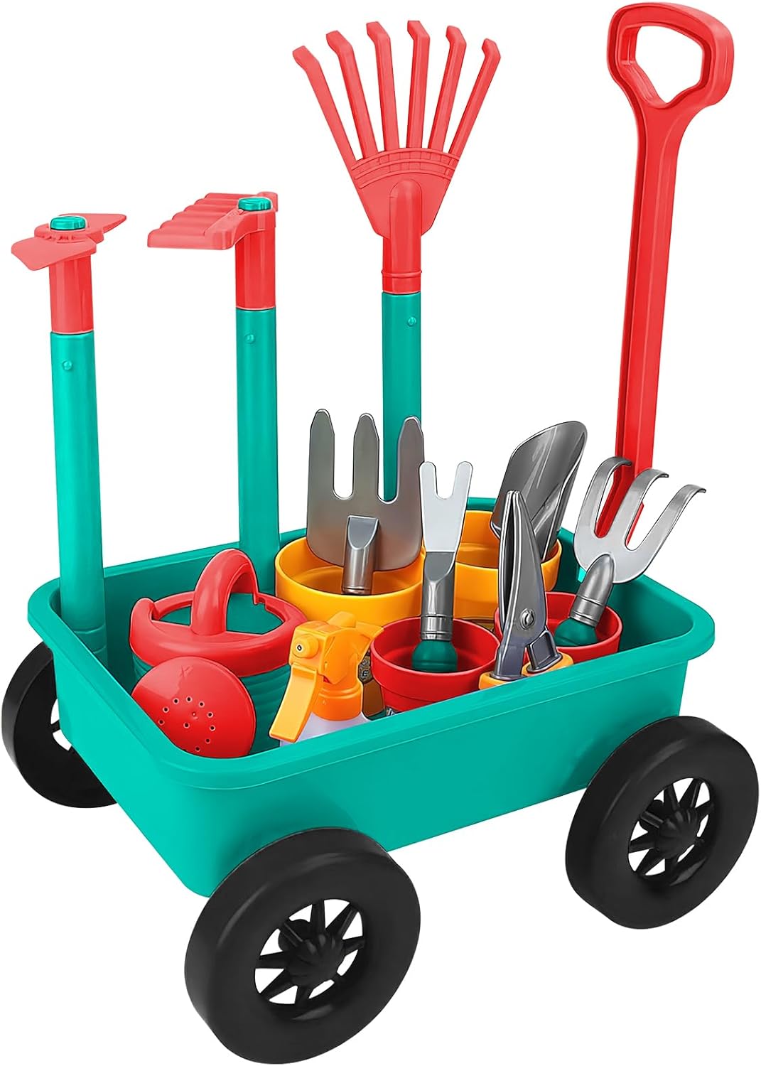 - deAO garten schubkarren fuer kinder set: 1 x sandspielzeug schubkarre, 1 x Laubrechen, 1 xRechen, 1 x Hacke, 1 x Handschere, 1 x Sprüher, 1 xGiesskanne, 1 x Handrechen, 2 x Handkultivierer, 4 xPflanztöpfe. Dieses Spielset enthält eine Vielzahl von