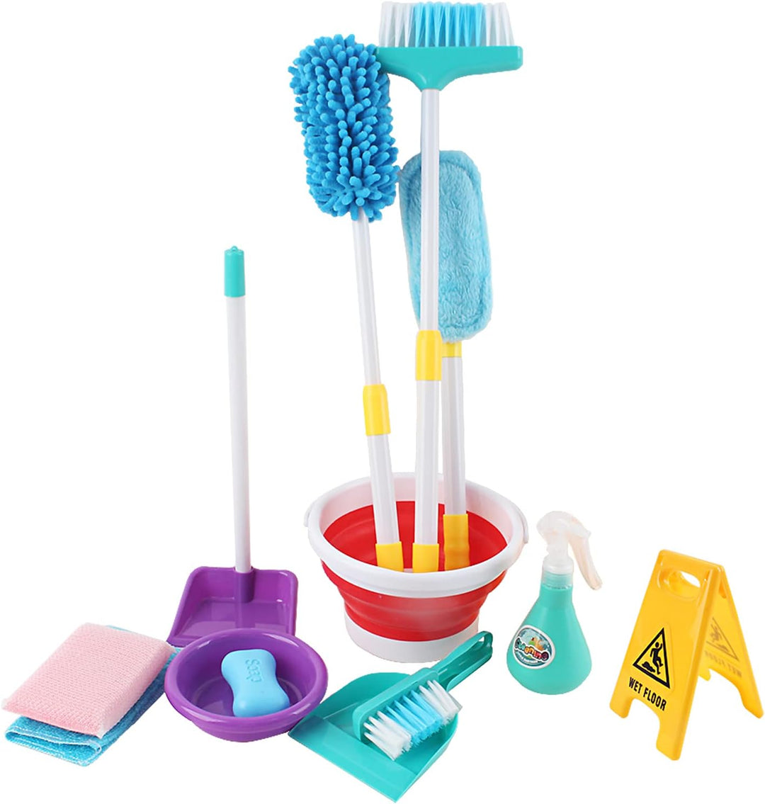 - INHALT: Das Set enthält realistisches Reinigungszubehör in Kindergrösse. eine grosse Kehrschaufel, ein Staubtuch, ein Besen, ein Mopp, ein Eimer, eine Sprühflasche, ein Mülleimer, ein Satz Müllsortierkarten und sogar ein Schild mit ACHTUNG! nasser Boden!