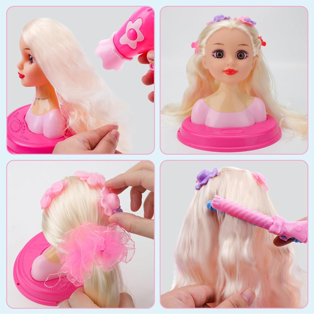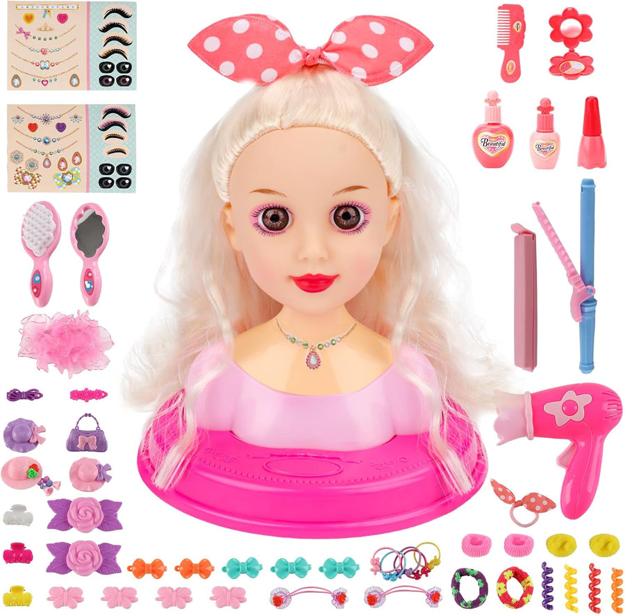 - Haarstyling-Puppenkopf-Set - Das kreative Set für kleine Friseure und Schminkkünstler! Dieses Set zum Haarstyling und Schminken ist ideal für Kinder. Es beinhaltet: 1 Friseurkopf, 2 Aufkleber, 1 Handtasche, 5 Haarwerkzeuge, 23 Haarnadeln, 5