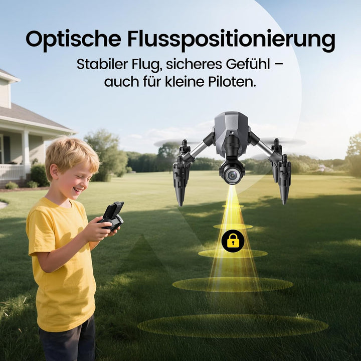 - Optische Flusspositionierung – Stabiler und einfacher zu steuern: Ausgestattet mit einem optischen Flusssensor ermöglicht die Drohne ein präzises Schweben auch ohne GPS. Unterstützt wird dies durch Funktionen wie One-Key-Start/Landung und