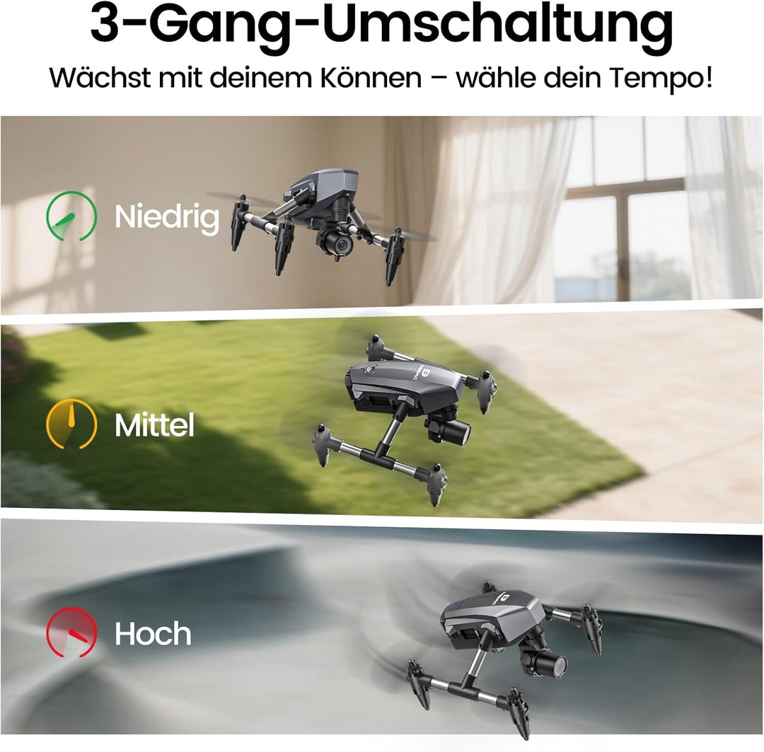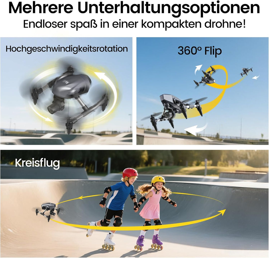 - Vielfältige Spielmodi – Mehr Flugspass garantiert: Erlebe spannende Funktionen wie 360°-Flip, Hochgeschwindigkeitsrotation, Flugbahnplanung, Schwerkraftsensor und One-Key-Kreisflug – für ein interaktives Flugerlebnis.