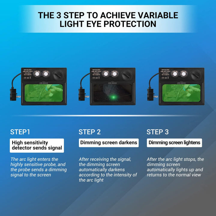 - Auto-Darkening-System zum Schutz von Augen und Gesicht vor schädlichen Funken, Spritzern und Strahlung bei normalen Schweissbedingungen