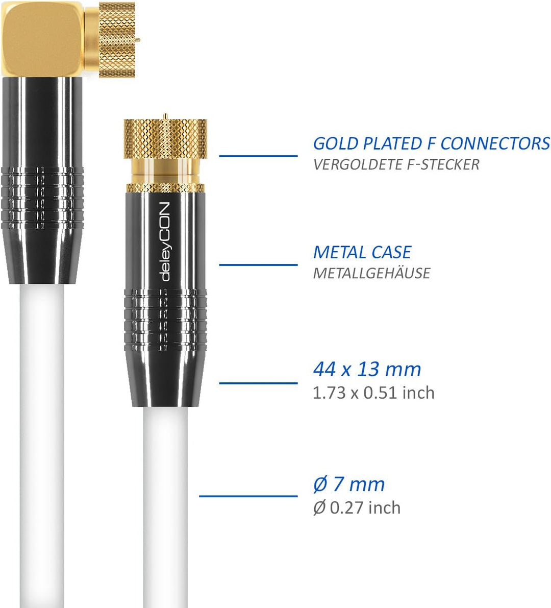 - Anschluss: F-Stecker zu F-Stecker (Koaxial) // Ausführung: 1x gewinkelter Stecker (90° Grad) zu 1x gerade Stecker