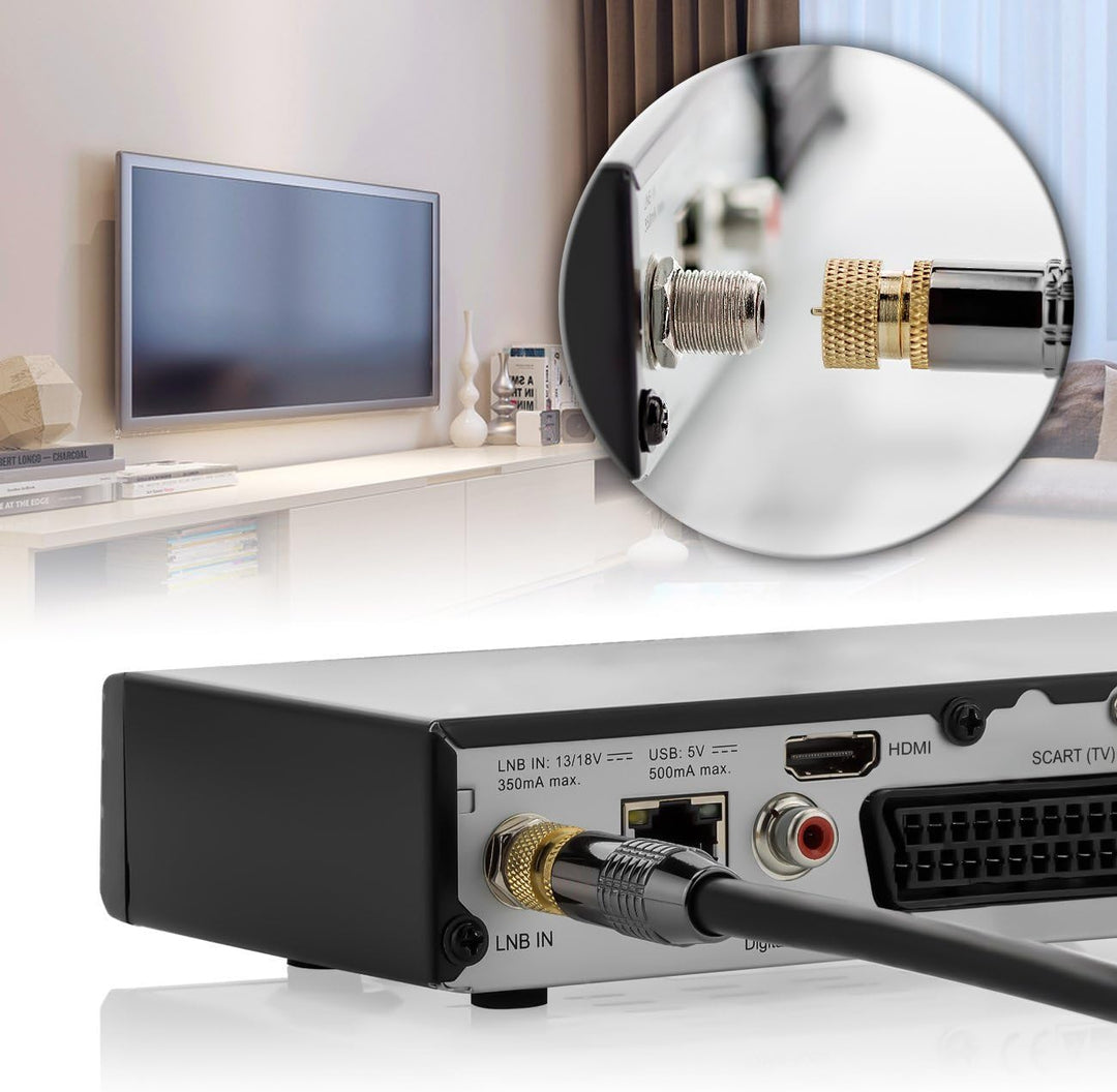 - Passgenaue, besonders leitfähige vergoldete F-Stecker mit Innengewinde aus Metall // Hervorragende, verlustfreie Übertragung, Signalqualität und Haltbarkeit // Flexibles Kabel - optimal zum verlegen